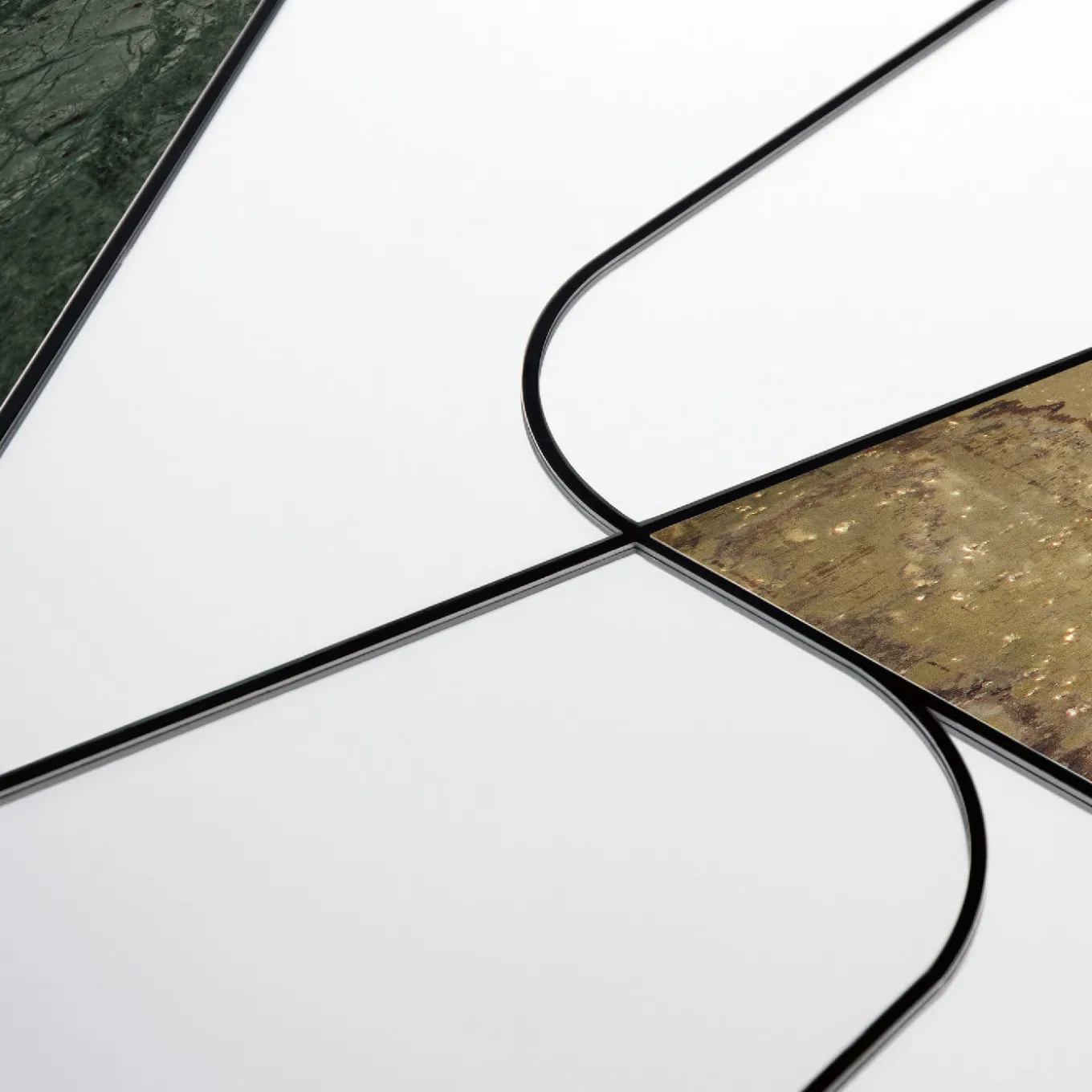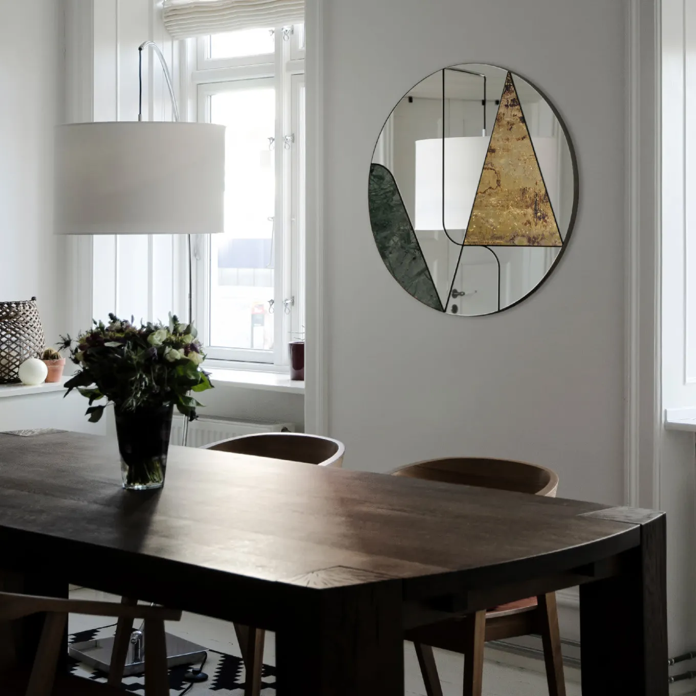This one-of-a-kind mirror is crafted by hand and will be a superb addition to a modern interior. Its striking combination of rigorous geometry and chromatic contrasts makes it a unique piece to showcase in any room. The round silhouette features a wooden base that supports a series of mirrored glass elements framed in a steel setting. A hand-finished brass triangle and a curved slab of splendid green Guatemala marble complete this striking, asymmetrical design.
