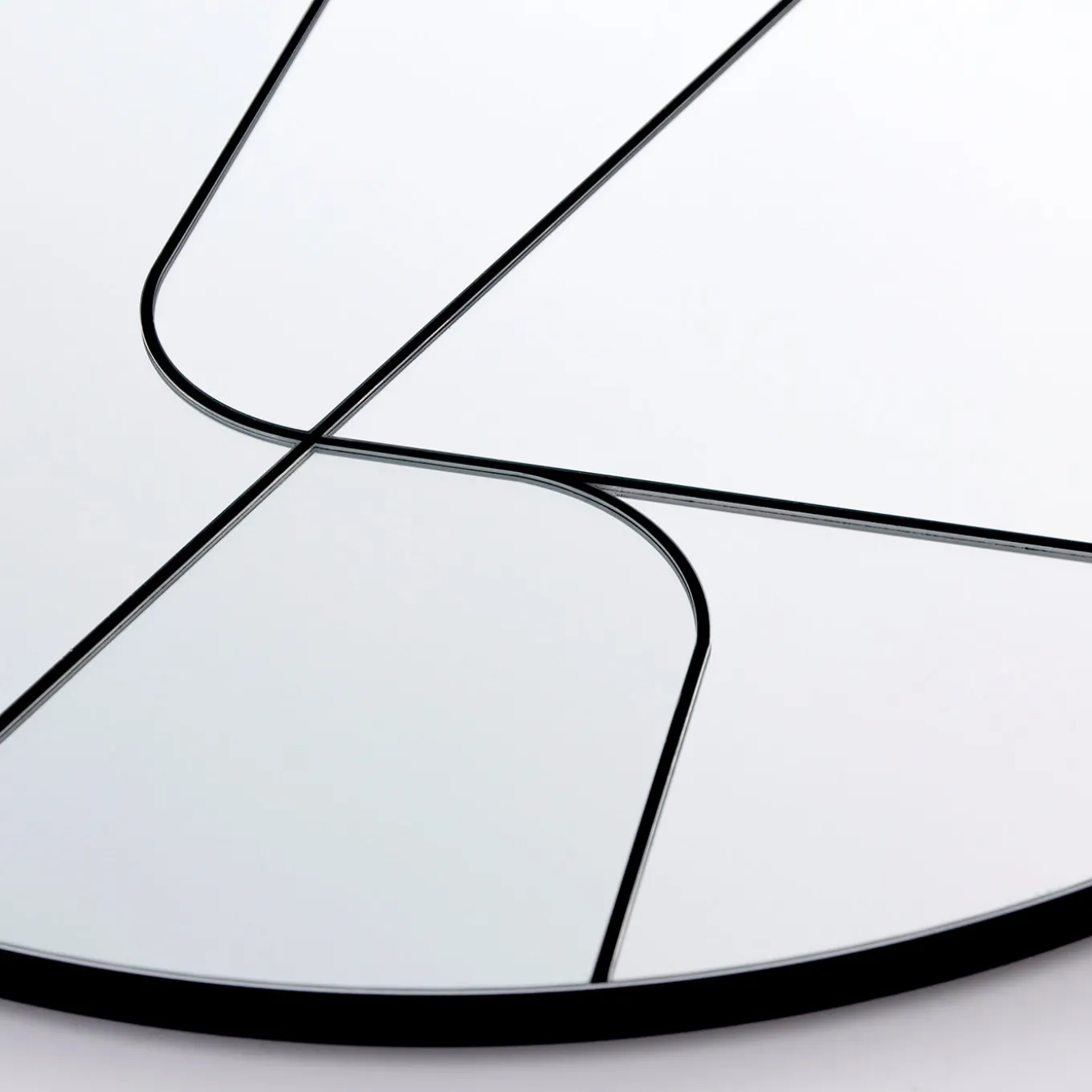 Part of the Insula Collection (“island” in Latin), this elegant mirror is an abstract rendition of the insular landscape of the Mediterranean Sea that will be a sophisticated addition to a contemporary decor. Its round silhouette is adorned with a series of asymmetrical lines, defining the space and adding a dynamic sense of movement. The wooden base supports the different mirrored elements, that are cut and assembled by hand in an aluminum frame.