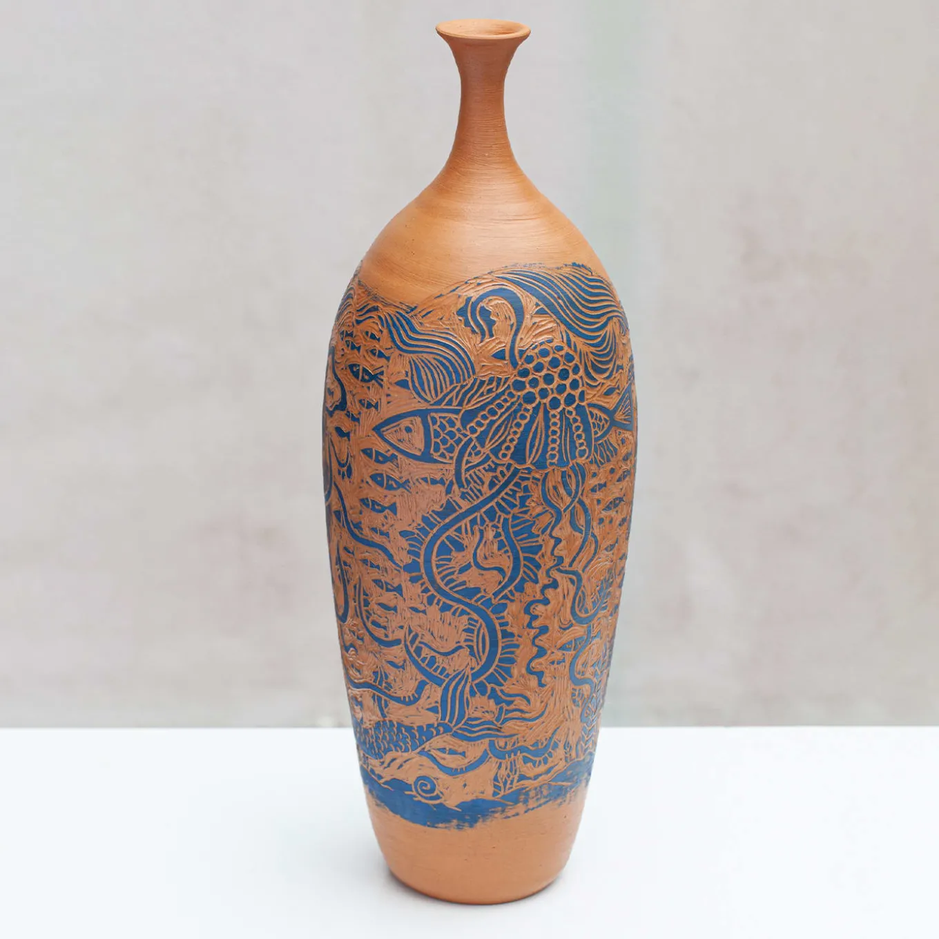 This stunning objet d’art, wheel thrown by Chiara Zoppei, revisits classic pottery through a modern lens. Featuring a stunning terracotta vase in a classic Lekythos silhouette shaped on a pottery wheel, embellished by captivating blue-hued engobes and a traditional “sgraffito” decorative layer, this distinctive vase recalls the marine creatures of ancient Greek mythology.