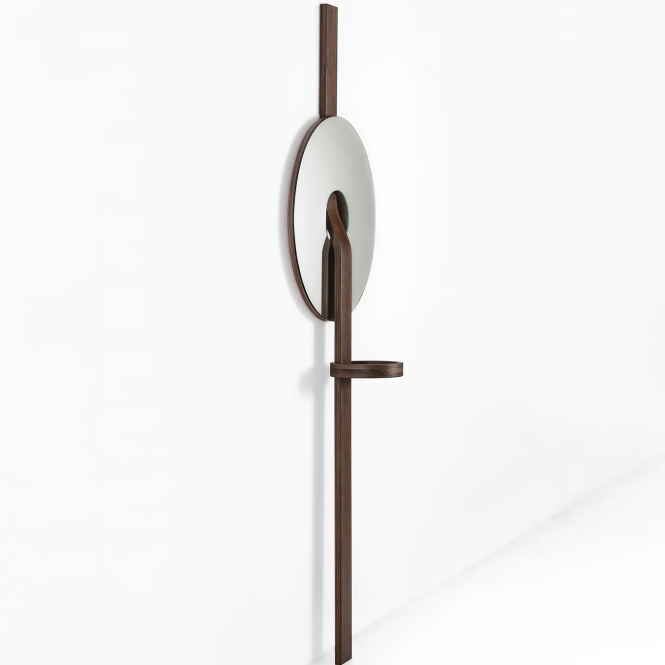 This wall mirror is a triumph of geometric volumes arranged in a sculptural composition of unmistakable contemporary inspiration. The disk-shaped mirrored glass element is pierced by the slightly curved band in solid Canaletto walnut that serves an essential structural function. The tiny, built-in tray completes the design.