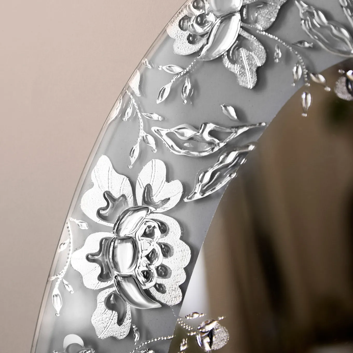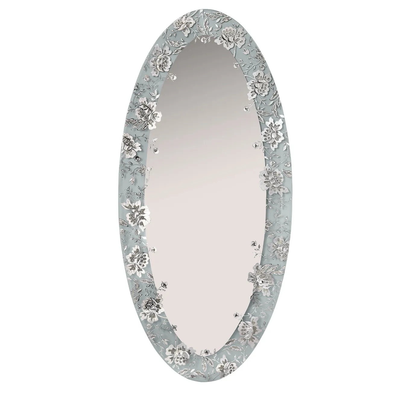 The Isabelle large oval wall mirror features an elongated silhouette that evokes elegance and grace, enhanced by its generous floral carving that adds intricate texture and depth. Each mirror is unique, with artisanal variations that highlight its handcrafted quality. Its tall proportions make it a striking accent piece, perfect for elevating the aesthetic of any wall with poetic refinement and classic charm.