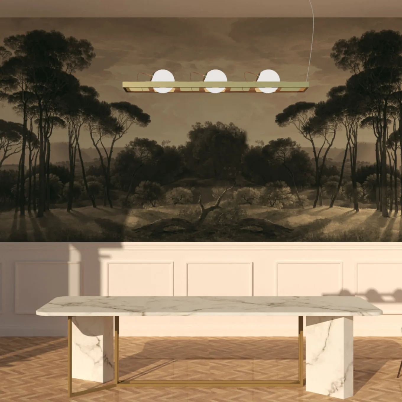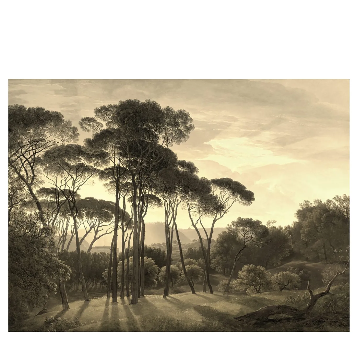 A modern and top-quality take on the trompe l’oeil paintings once adorning noble abodes, this wallpaper from the Panorama Collection depicts a serene hilly landscape with the rays of dawn filtering through the trees. Every detail is impeccably rendered on sustainable, PVC-free paper, emphasizing the illusion of an open window without compromising on durability. Like all of the other designs from the brand, it can be reproduced on Kerlite® or on glass fiber, please ask the Concierge for pricing. Price is per squared meter.