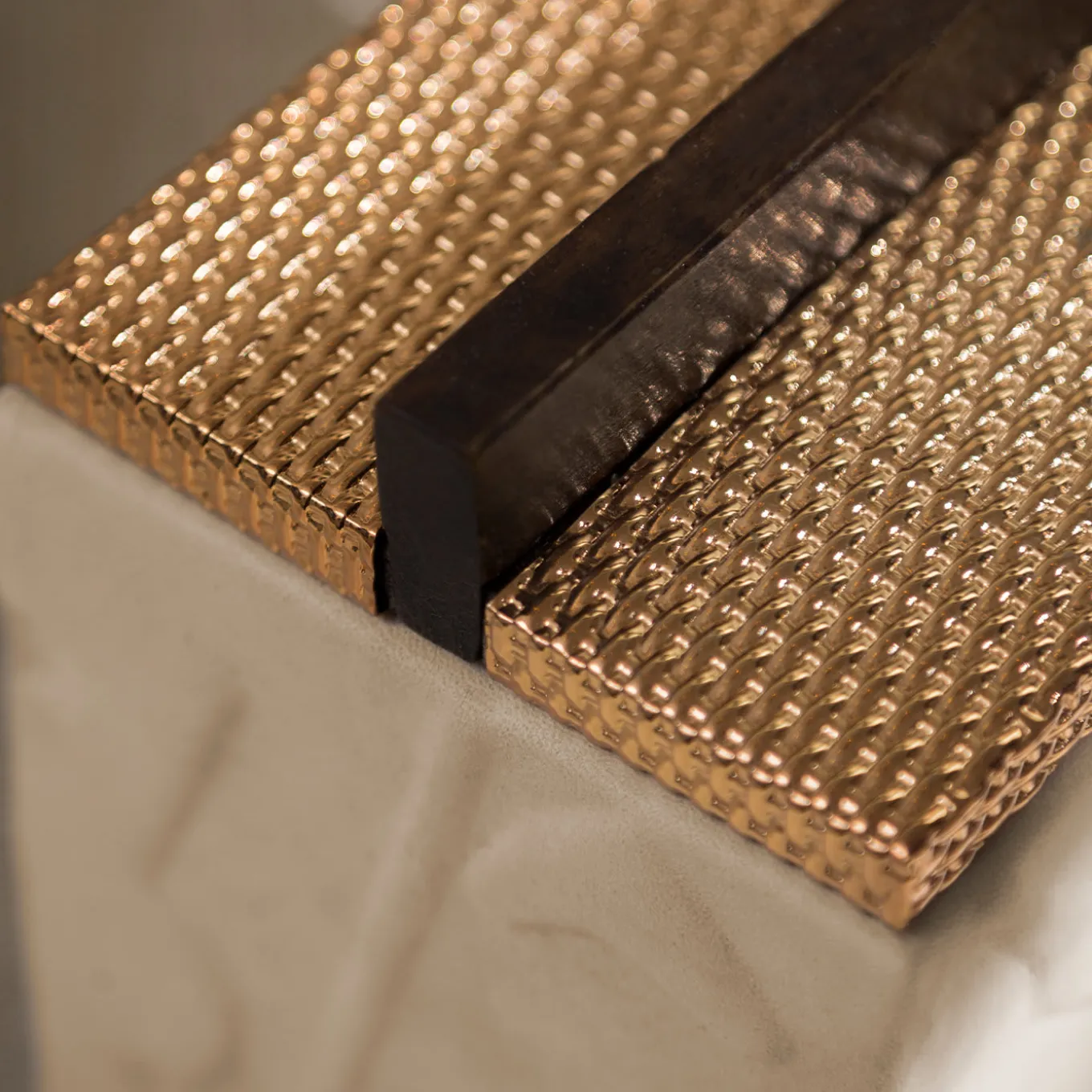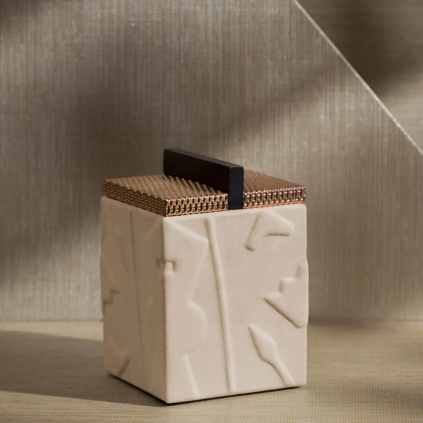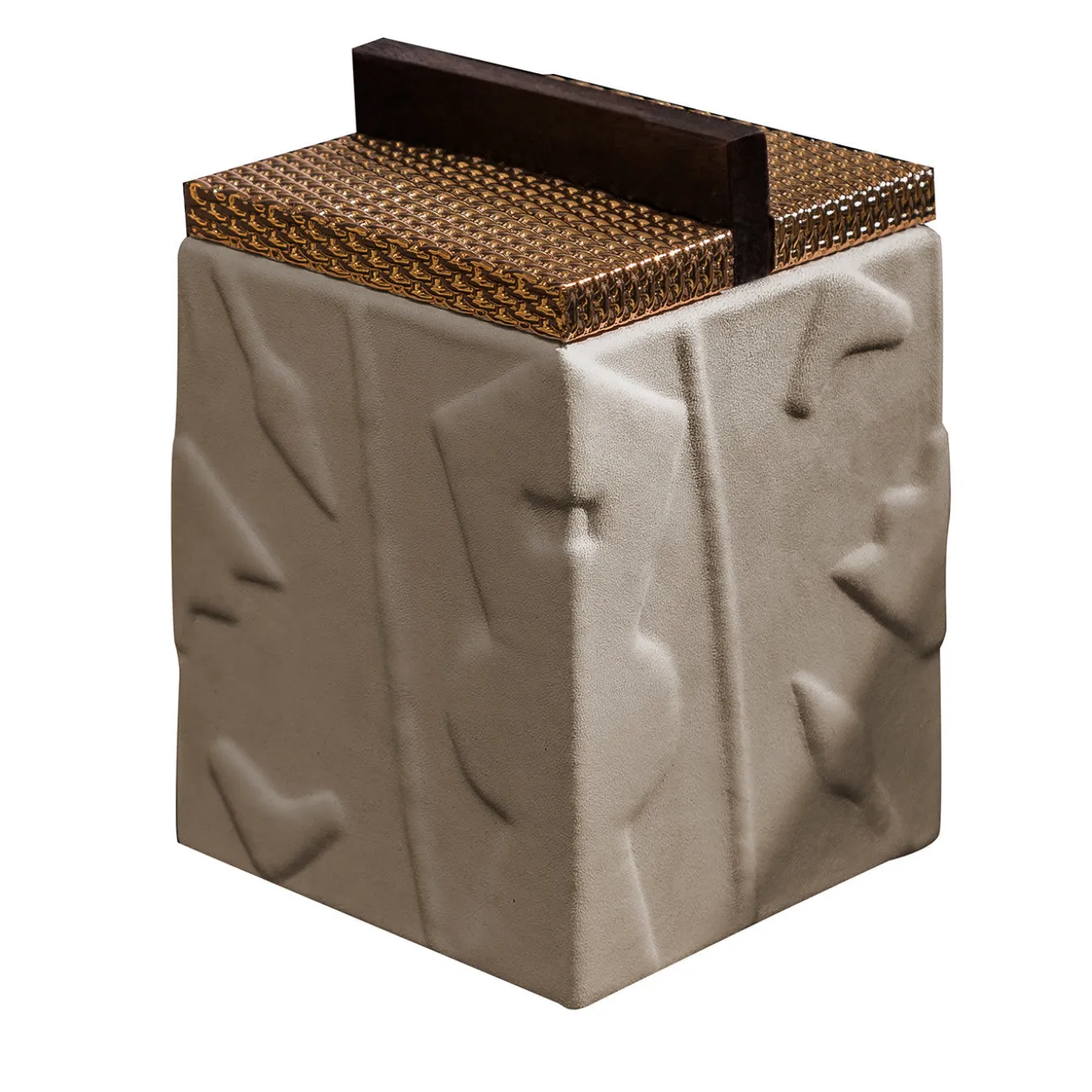 This enchanting box from the Bacabs Collection merges functionality and decorative appeal, allowing it to uplift any surface from vanities to refined desks. Subjects borrowed from pre-Columbian art inspired the raised motif adding textural spin to the solid Canaletto walnut structure, which is finally wrapped in prized, beige Nubuck leather for a superb tactile feel. The linear wooden handle echoes Rationalism and counterbalances the sheen conferred by the brass-finished mesh-like lid.