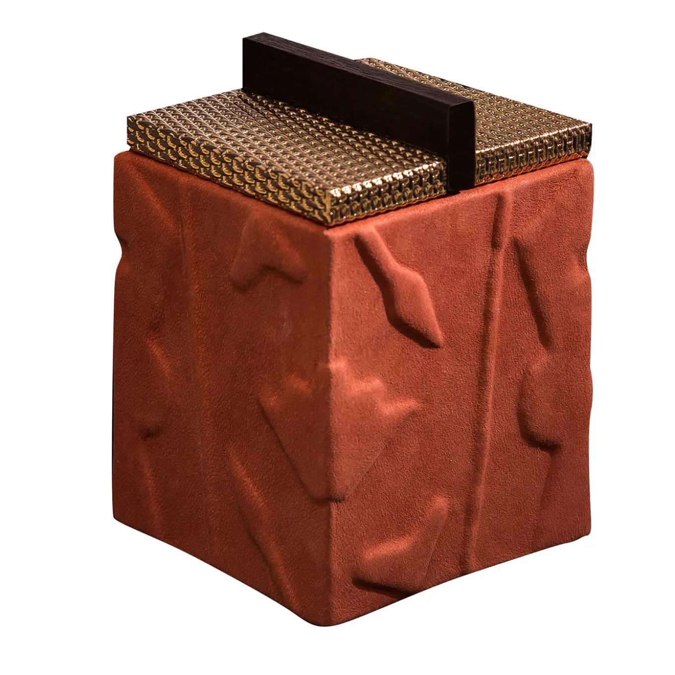Pure geometric volumes evoking Rationalist architecture merge with primitive artistic accents in this precious box. The raised motif enlivening the solid Canaletto walnut structure was inspired by pre-Columbian figures, while the mesh-like texture enriching the brass-finished metal lid has its dazzling look interrupted by a linear wooden handle echoing the rigorous volumes typical of Rationalist style. A luxe upholstery in coral-hued Nubuck leather seals the design.