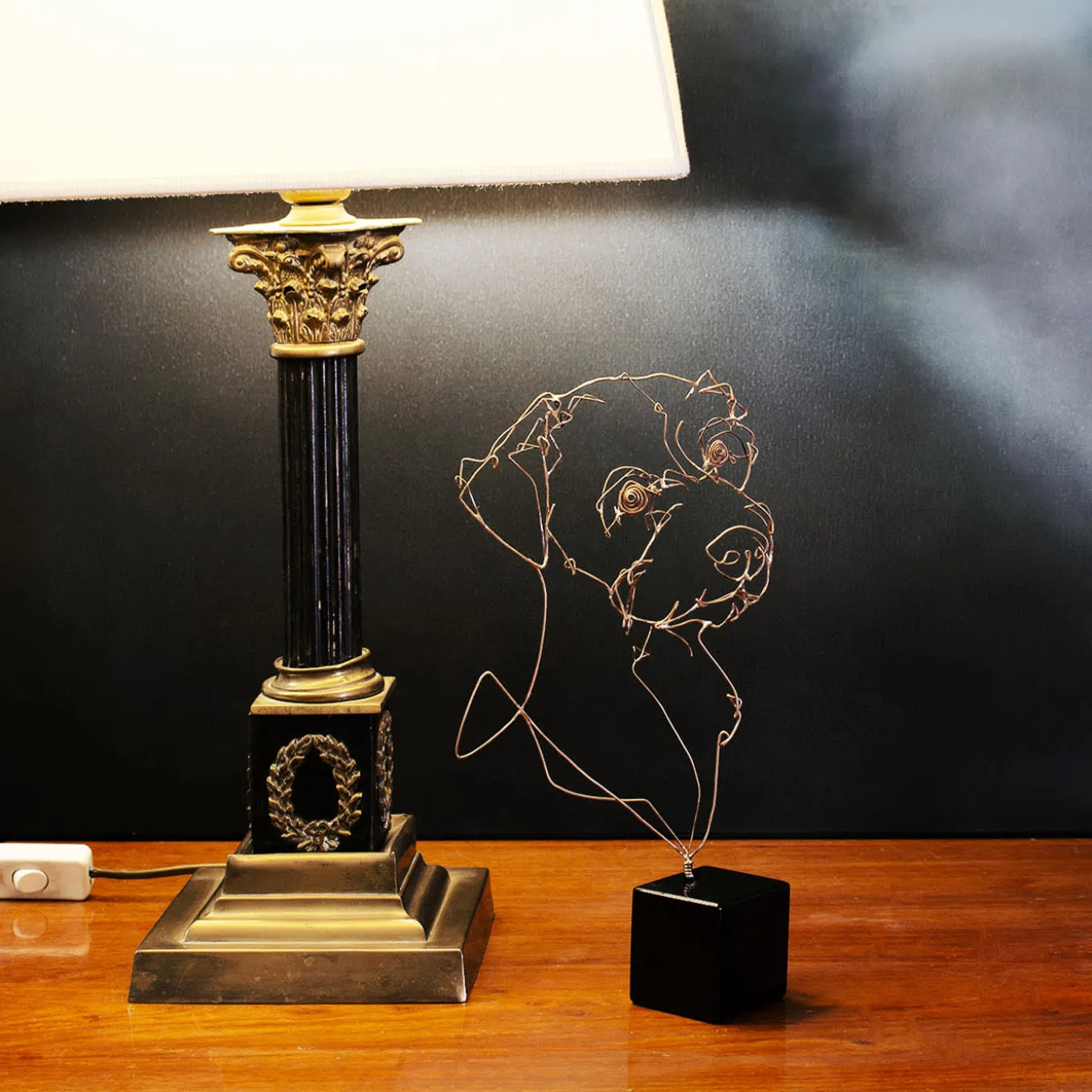 A deftly handmade miniature of a Jack Russell Terrier’s snout, this statuette can be customized with a portrait of one’s own dog, or any other dog breed. An original gift for an animal lover, it is fashioned of metal wire and supported with a polished black cube base. Other 69 dog breeds are available, please ask the Concierge for more information and customization options.Pomeranian bronze wire.