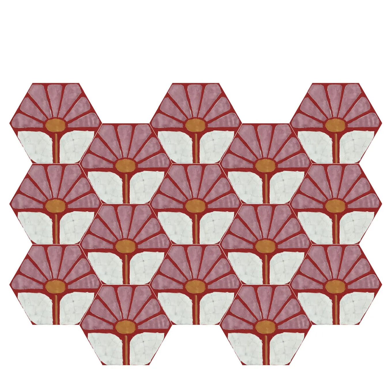 Masterful craftsmanship breathes life into this stunning hexagonal tile composition. Featuring vibrant hand-painted floral motifs in soft pink, these tiles create a striking contrast against the matte gray backdrop. The unique hexagonal shape enhances the design’s bold yet elegant appeal, perfect for transforming any wall or floor into a dynamic and captivating surface. With 160 tiles per square meter, this artwork brings a fresh and artistic touch to any space. Price is per square meter.