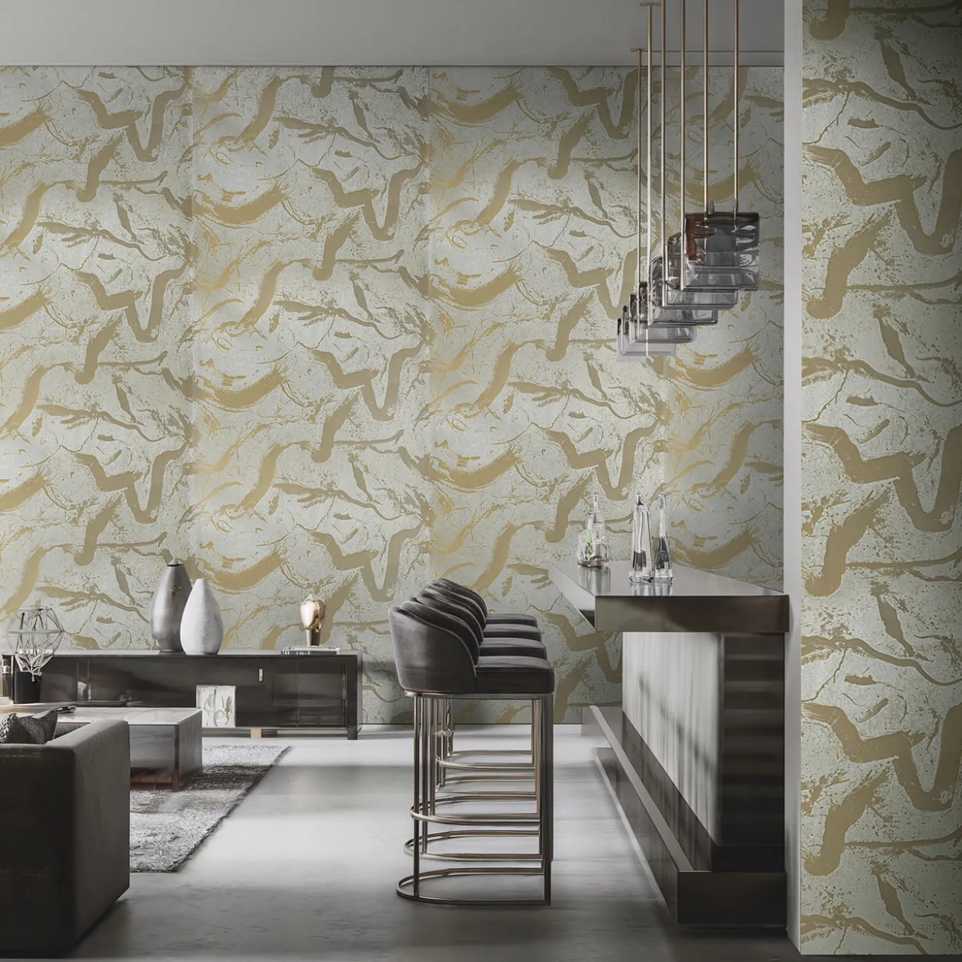 Jazz glam velvet metallic gold wallpaper combines a sculpted velvet base with metallic foil accents to create a textured, three-dimensional effect. The intricate design features fluid, abstract brush strokes that shimmer like liquid gold, providing a dynamic interplay between soft texture and radiant metal. This wallpaper adds a refined dramatic touch, ideal for sophisticated interiors seeking subtle sparkle and visual depth. The price is per linear meter. The minimum order quantity is 6 linear meters. Orders below 6 linear meters are accepted with an additional fee of 150 euro.
