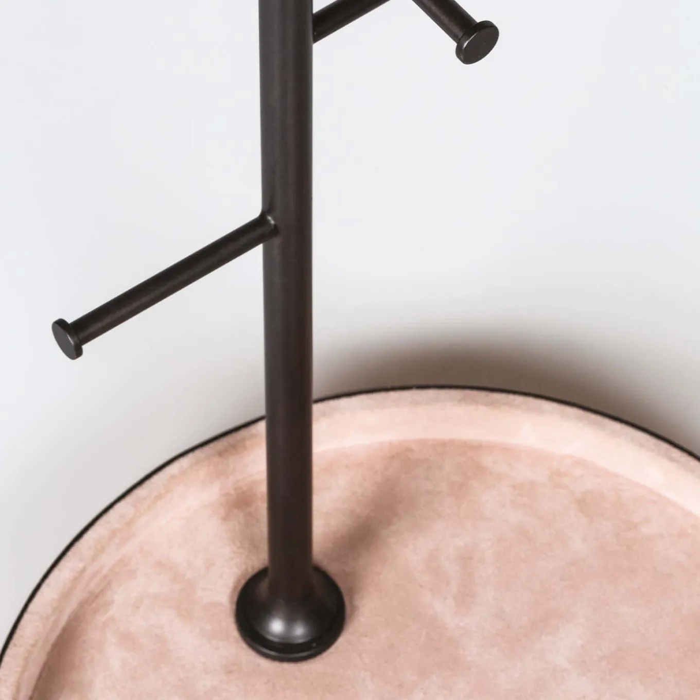 Metal structure available in three finishes provided with extensions to hang necklaces, bracelets, and rings. A leather-covered wood-heavy-based valet tray grants the product perfect stability.