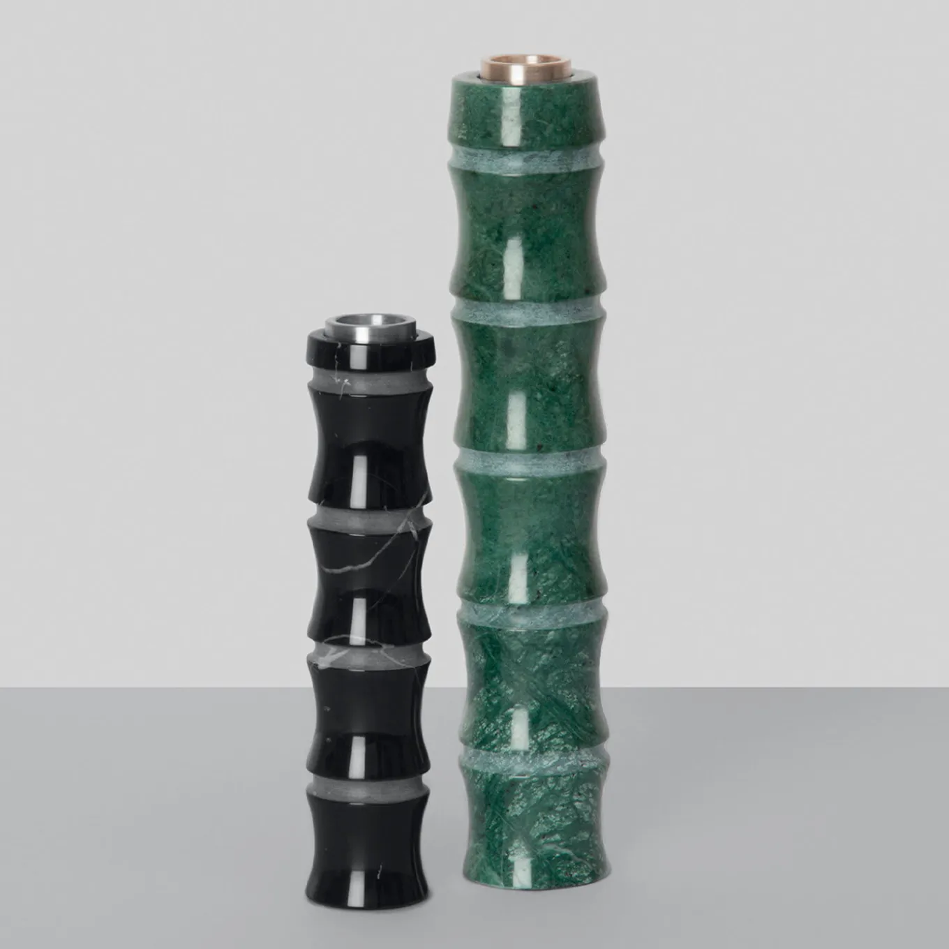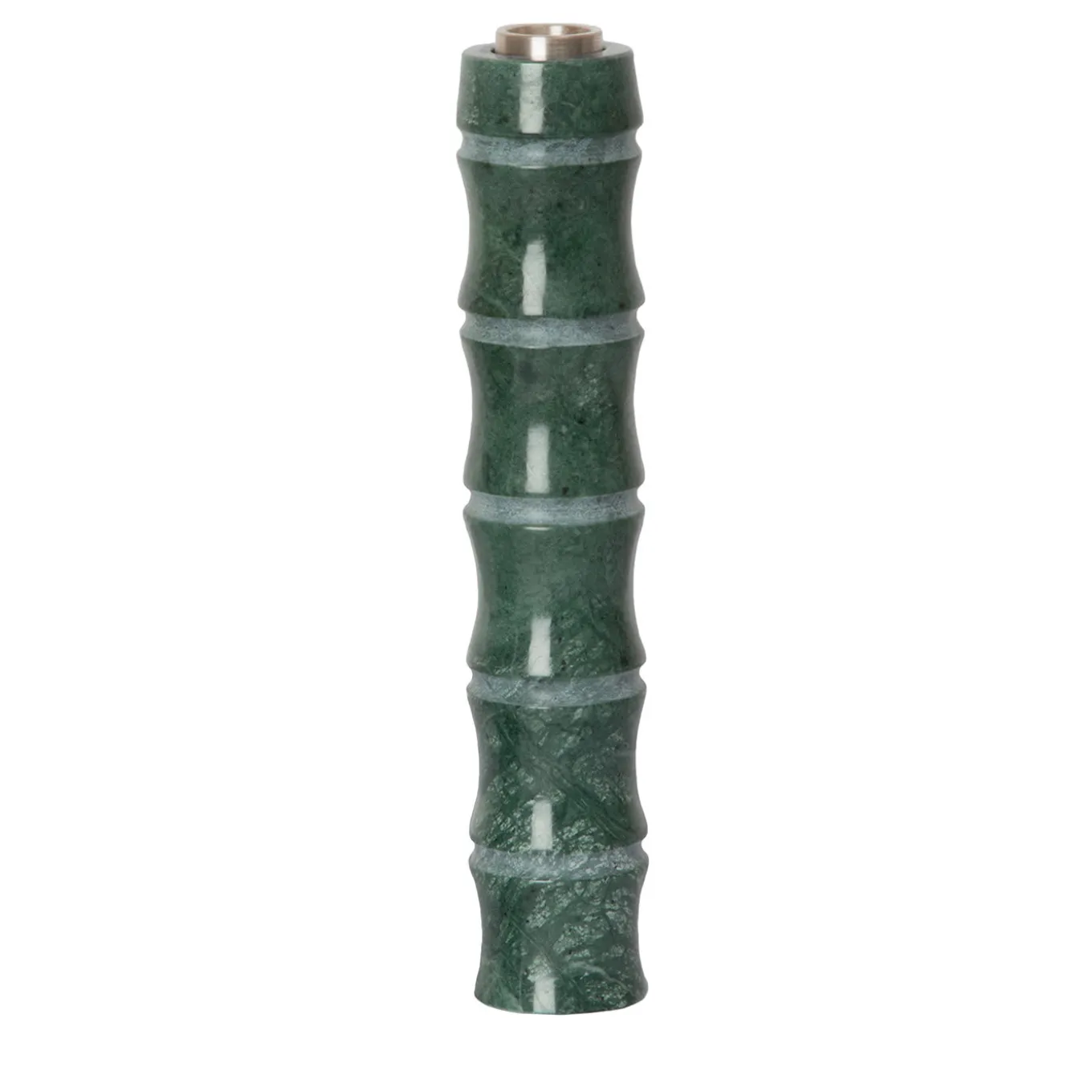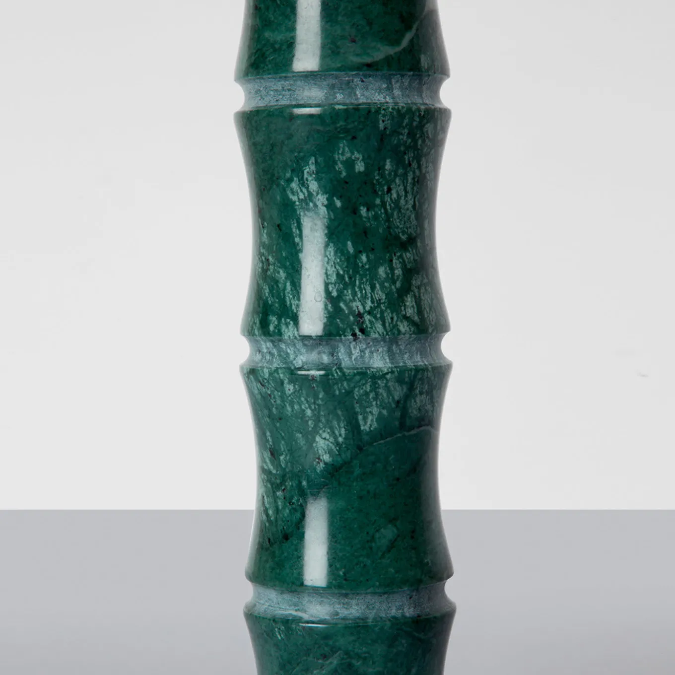 This exquisite candleholder in prized green Guatemala marble borrows its phytomorphic shape from the grace of bamboo canes, as an homage to the charm of Eastern art and culture. Ideal to be displayed alongside its vase counterpart for a cohesive look, the design flaunts an entirely unique aesthetic as a result of the inherent uniqueness of marble. A superb synthesis of excellent manufacturing and first-rate natural materials, this candleholder makes for a refined housewarming gift. Please note that marbles and stones are natural materials and they can differ also if coming from the same quarry or the same block. The product shown may differ from purchased items. Every piece is unique.