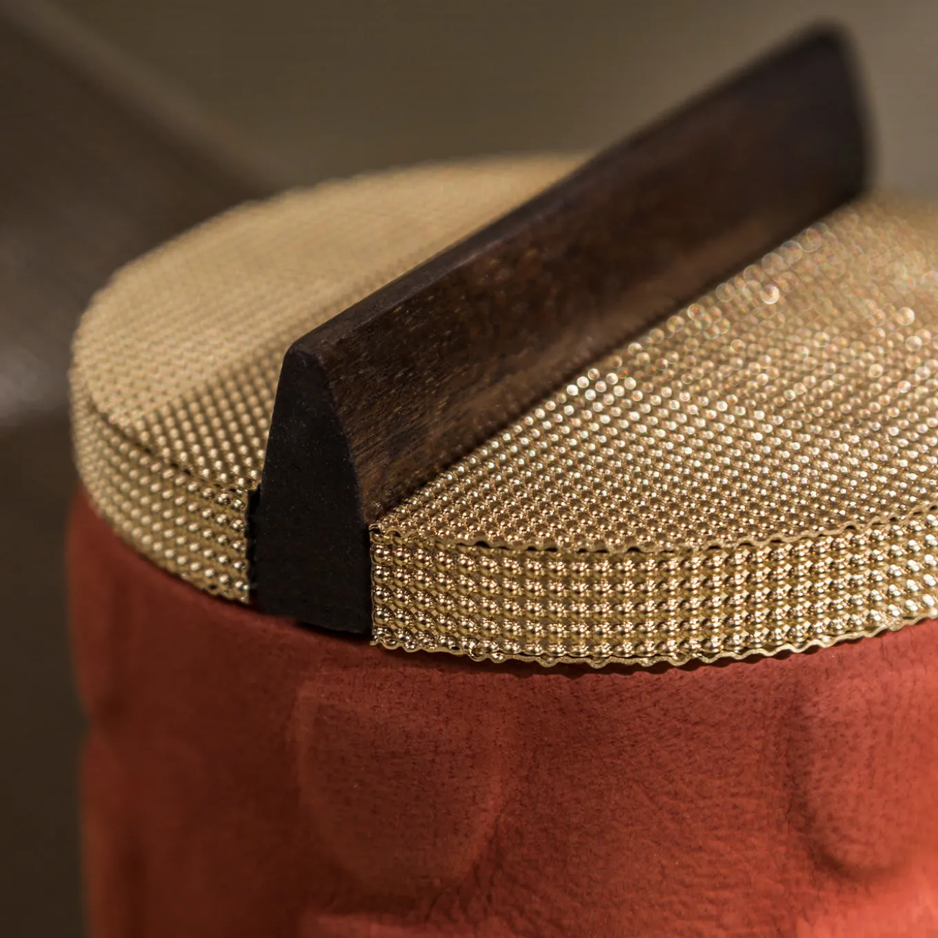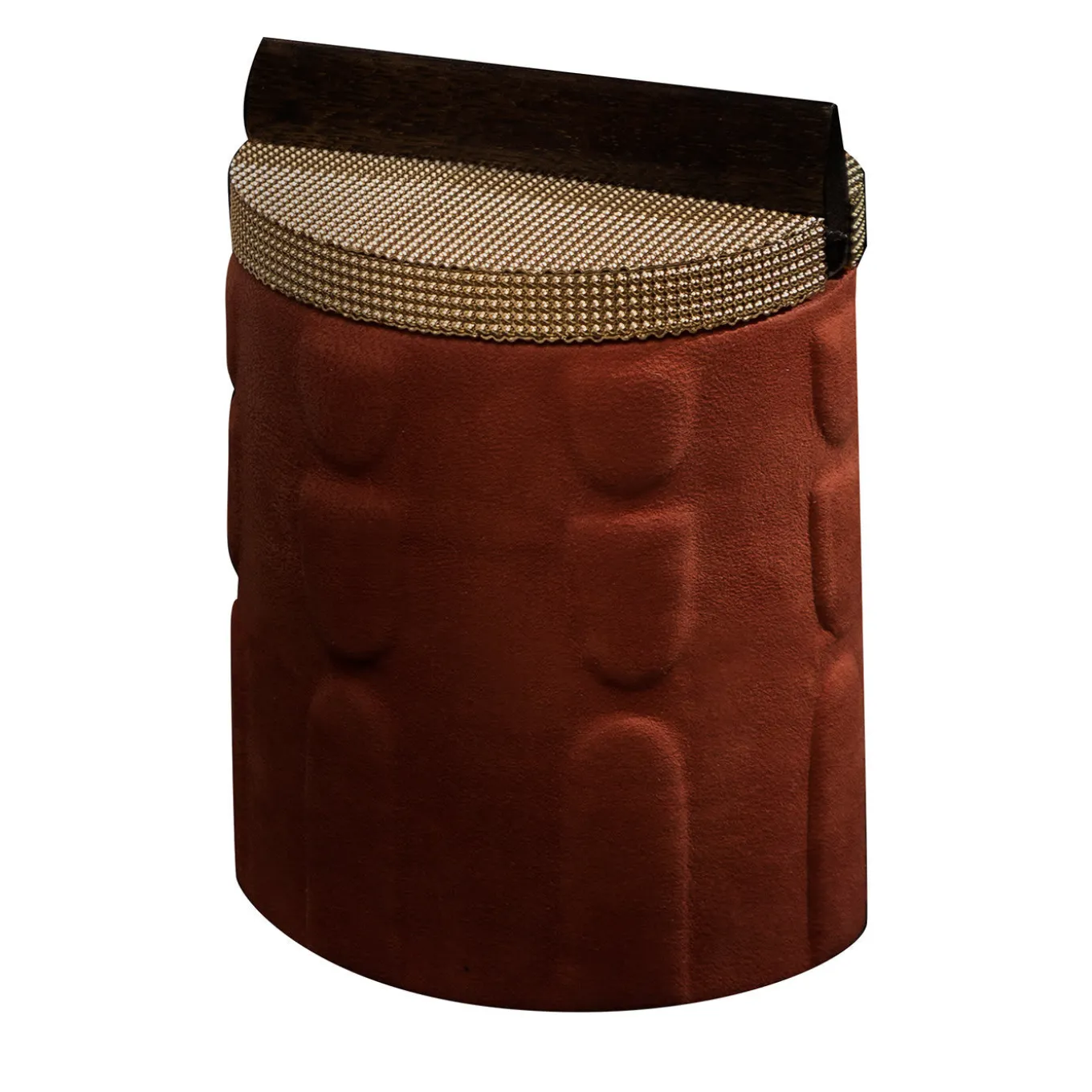 This exclusive, handcrafted box from the Bacabs Collection makes for an impeccable addition to a personal collection of luxury containers for jewels. Its cylindrical body in solid Canaletto walnut is enriched by raised silhouettes borrowed from pre-Columbian art and enhanced by the precious upholstery in coral-hued Nubuck leather for a seductive twist. A linear wooden handle – celebrating Rationalist lines – splits the glowing mesh-like brass lid in two semi-circular halves.