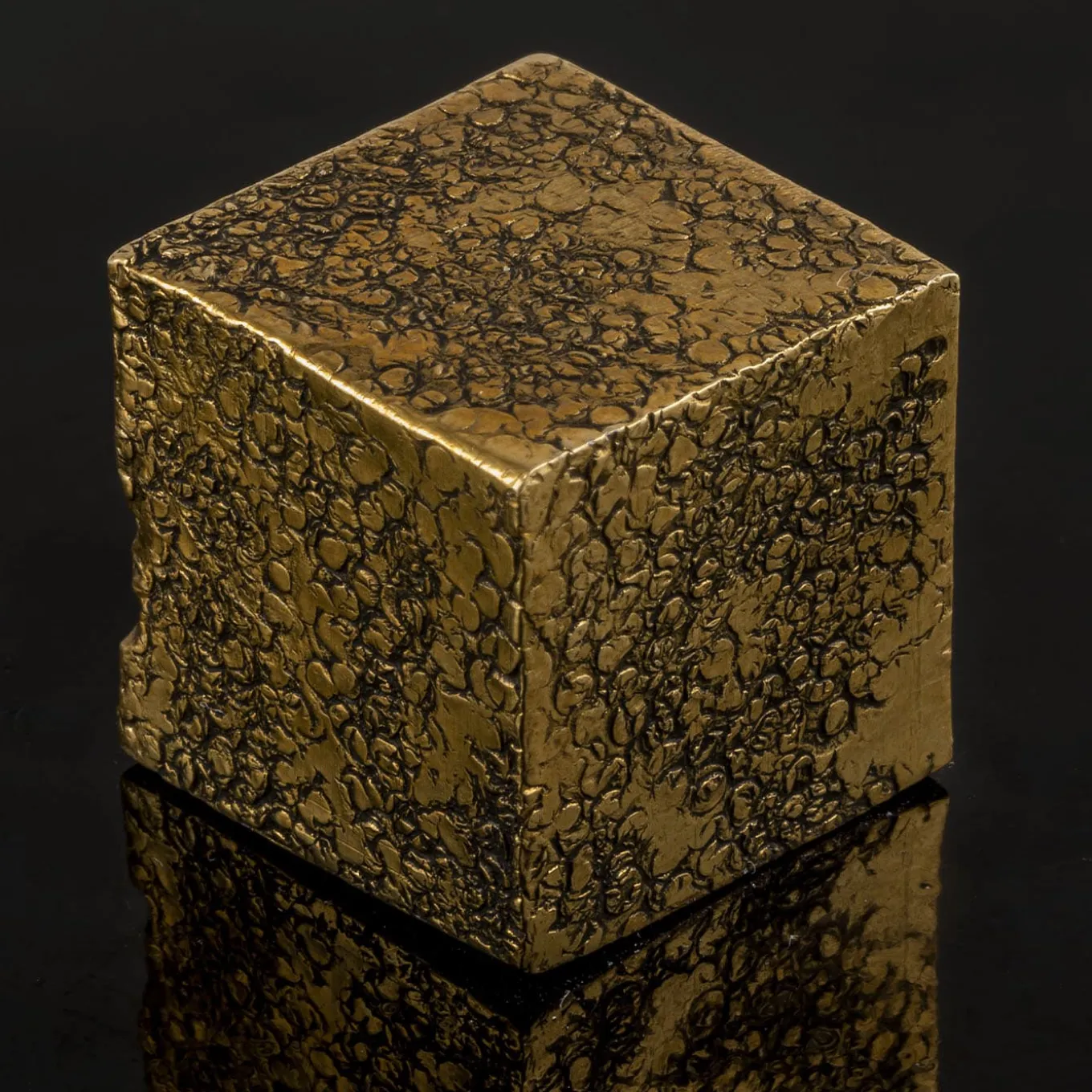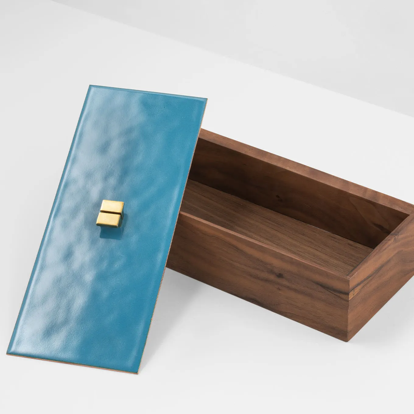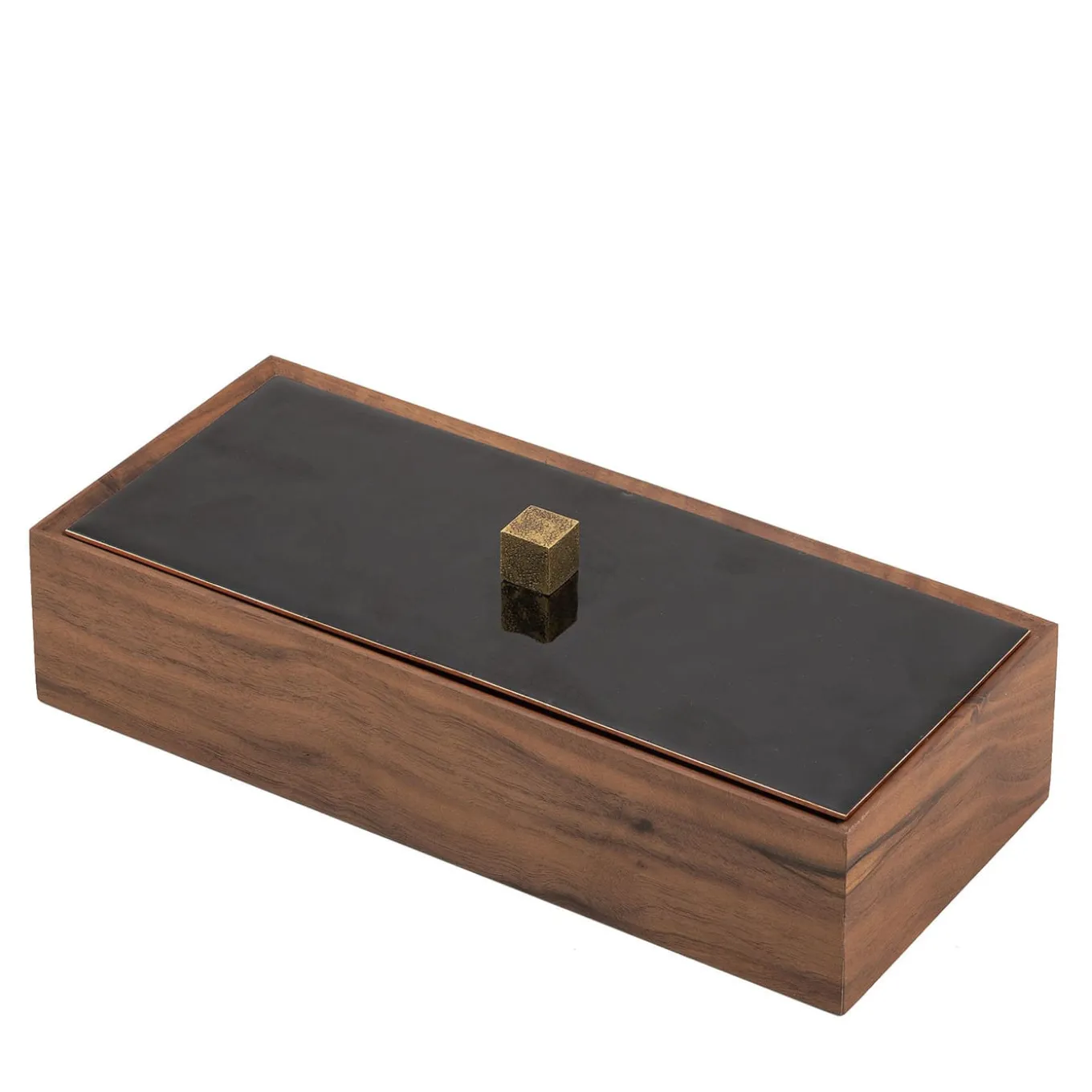 A rectangular jewelry box in solid walnut and bergamot oil with enameled copper stopper. This box has a foldable lid, that can be used from both sides, each characterized by a different handmade brass knob.