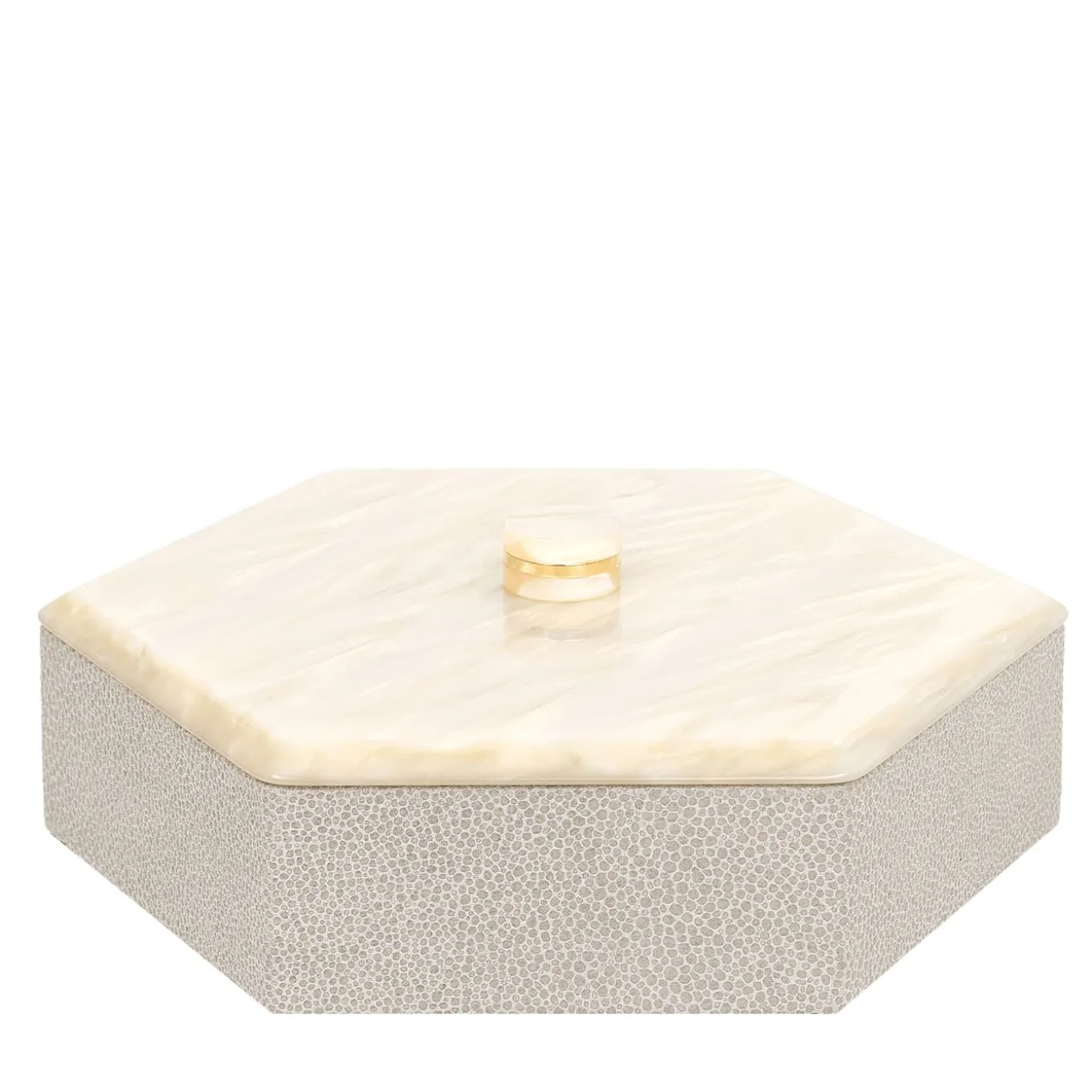 A precious and sophisticated design handcrafted of first-rate materials, this leather-upholstered box is enriched with a splendid lid fashioned of resin finished in a mother-of-pearl shade harmoniously blending with the cream shade of the hexagonal container. Please consult the Artemest catalog for other designs from the Kelly series.