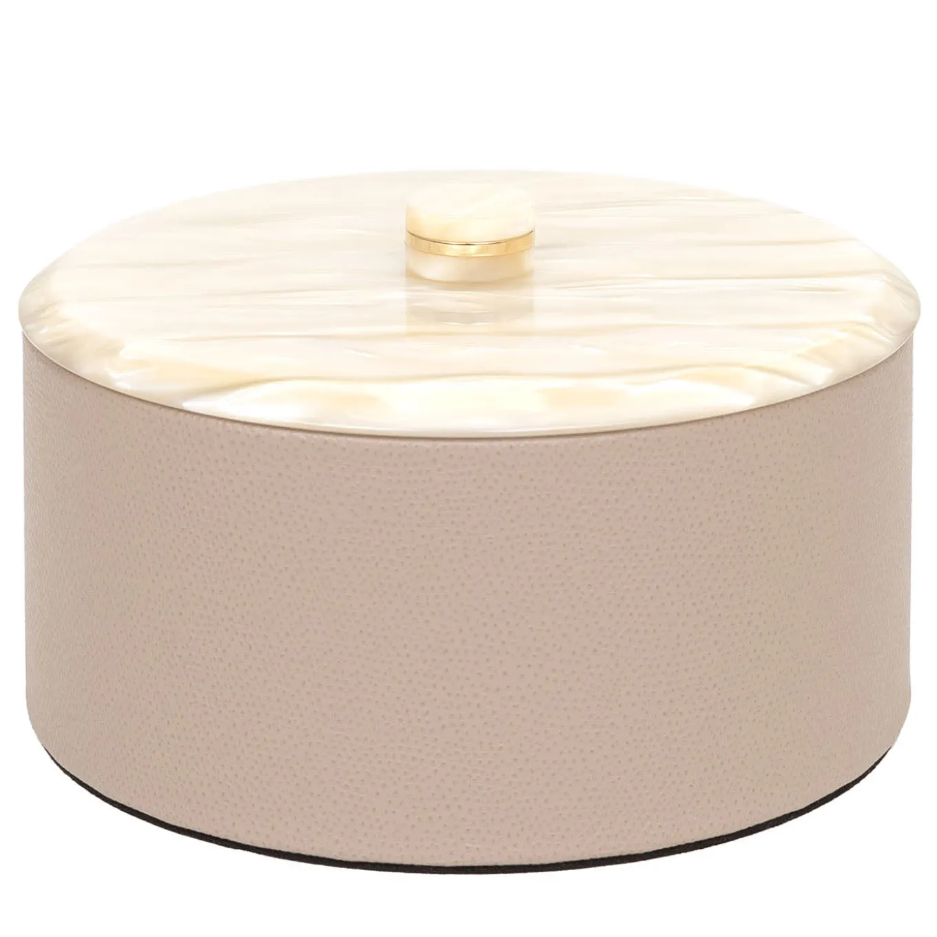This exquisite box allows for gathering jewelry essentials or more small items within a truly sophisticated case. Equipped with a nacre-effect resin lid with coordinated finial, its cylindrical frame is covered with fine taupe-hued leather, a characteristic that unmistakably states its sartorial allure. Multiple sizes and hexagonal-cut versions are also available in the Artemest catalog.