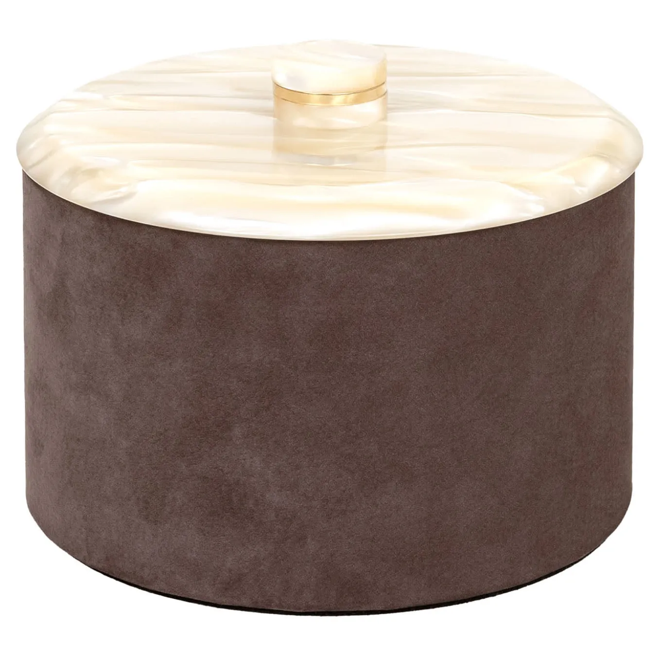 Fine brown leather envelops the cylindrical silhouette of this precious box, an exclusive design completed by a flat resin top that boasts a stunning nacre effect. Sealed by a coordinated finial, the top brightens up the whole design, somehow anticipating the sheen of the jewelry that might be gathered within. Multiple sizes and finishing variants are available in the Artemest catalog.