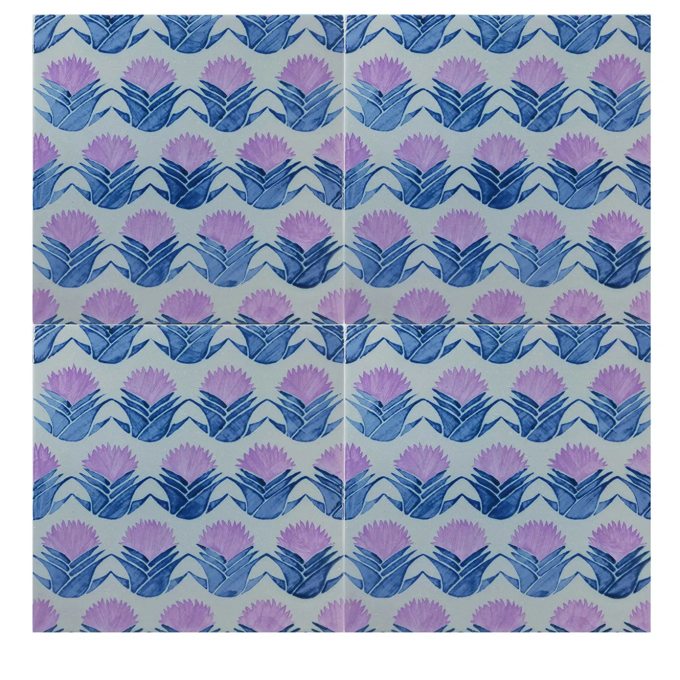 An extraordinary burst of color, this set of four ceramic tiles will infuse a modern interior with a bold and iconic character. A tribute to the wildlife found on Mount Etna, it belongs to a series of sustainably handcrafted tiles designed by Vincenzo Messina. Colored in a delicate green tone, each tile is decorated by hand with a blue and lilac wild cardoon.