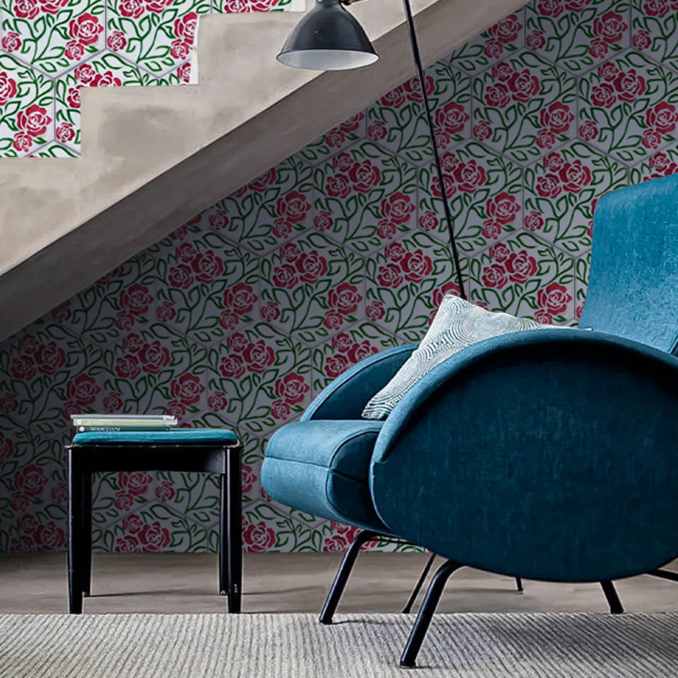 Sinuous, graceful lines define the wild roses adorning the hexagonal shape of these four ceramic tiles, creating an alluring interplay of geometries. Designed by Vincenzo Messina for the Kimeya Collection of sustainably handcrafted pieces, this set pays tribute to the inspiring wildlife growing on Mount Etna volcano in Sicily.
