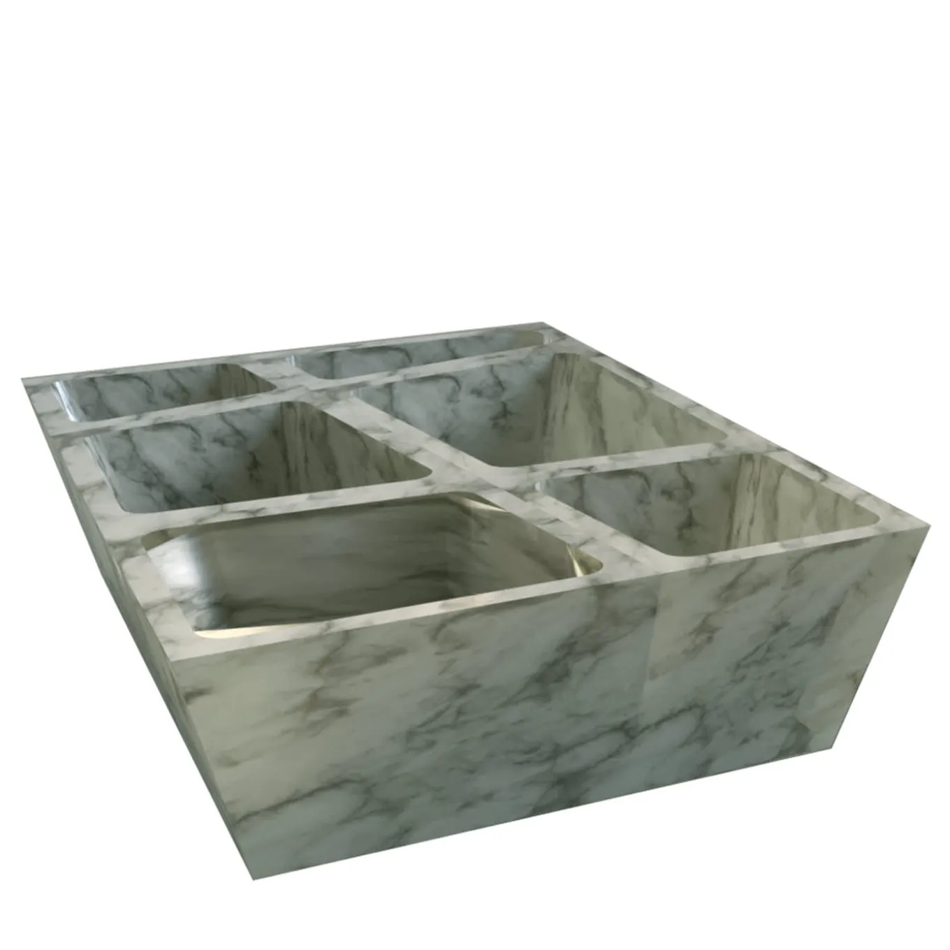 Kiru is a high-craftsmanship, versatile and multipurpose object made of Carrara marble. It is a pocket emptier, a bath or aperitif set. It is composed of six small irregular bowls that joined together to form a unicum. Elegant and functional, it embellishes a dining table, a console table or a countertop with its linear and strong personality.