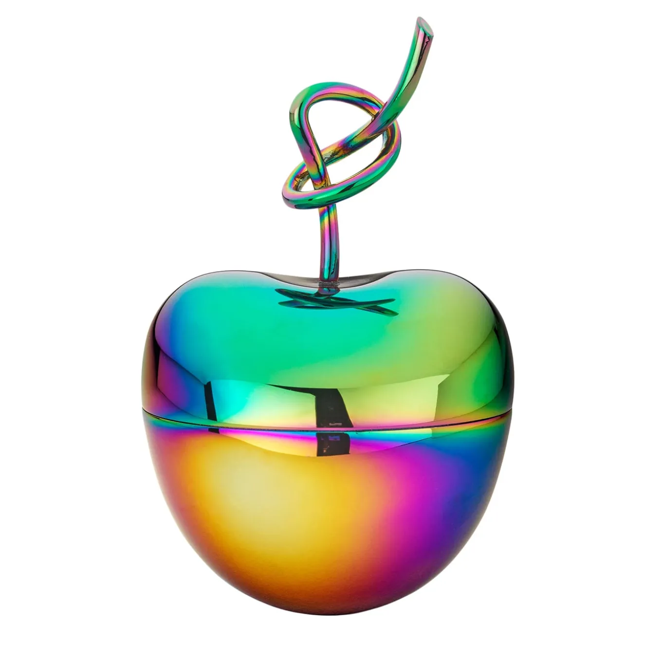 The Knotted Cherry decorative box features a distinctive knotted stem design atop a smooth, rounded container inspired by the shape of a cherry. Its reflective, multicolor finish lends a vibrant, iridescent quality that captures and plays with light. The box serves as a stylish storage solution for personal treasures or keepsakes, combining whimsical design with functionality to create an eye-catching statement piece for any interior.