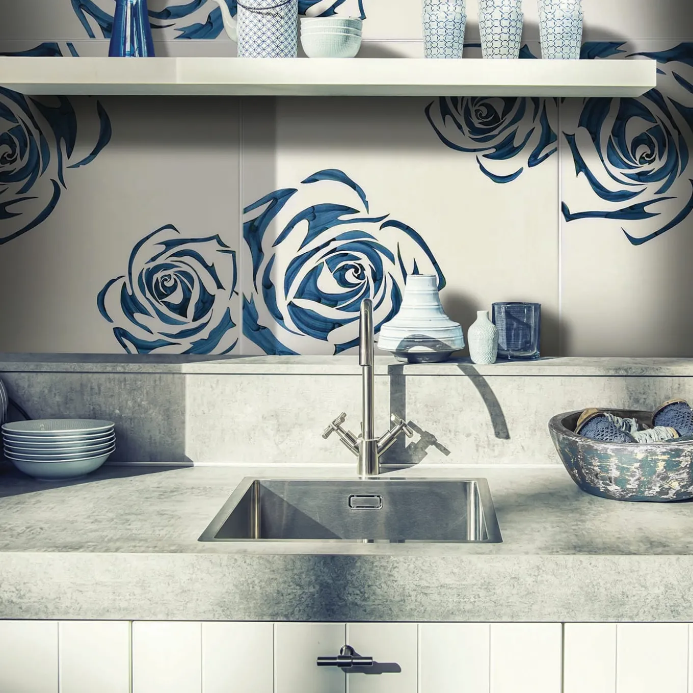 This stunning ceramic tile features an elegant floral design of roses in various sizes and colors hand-painted on a white-glazed, slightly uneven surface. Its classical color palette of white and blue adds a refined touch and romantic look to any room decor. Suitable for extra-heavy traffic areas (Class PEI 5 rating), it can be used for floor an wall applications. Please contact the Concierge for additional technical details.