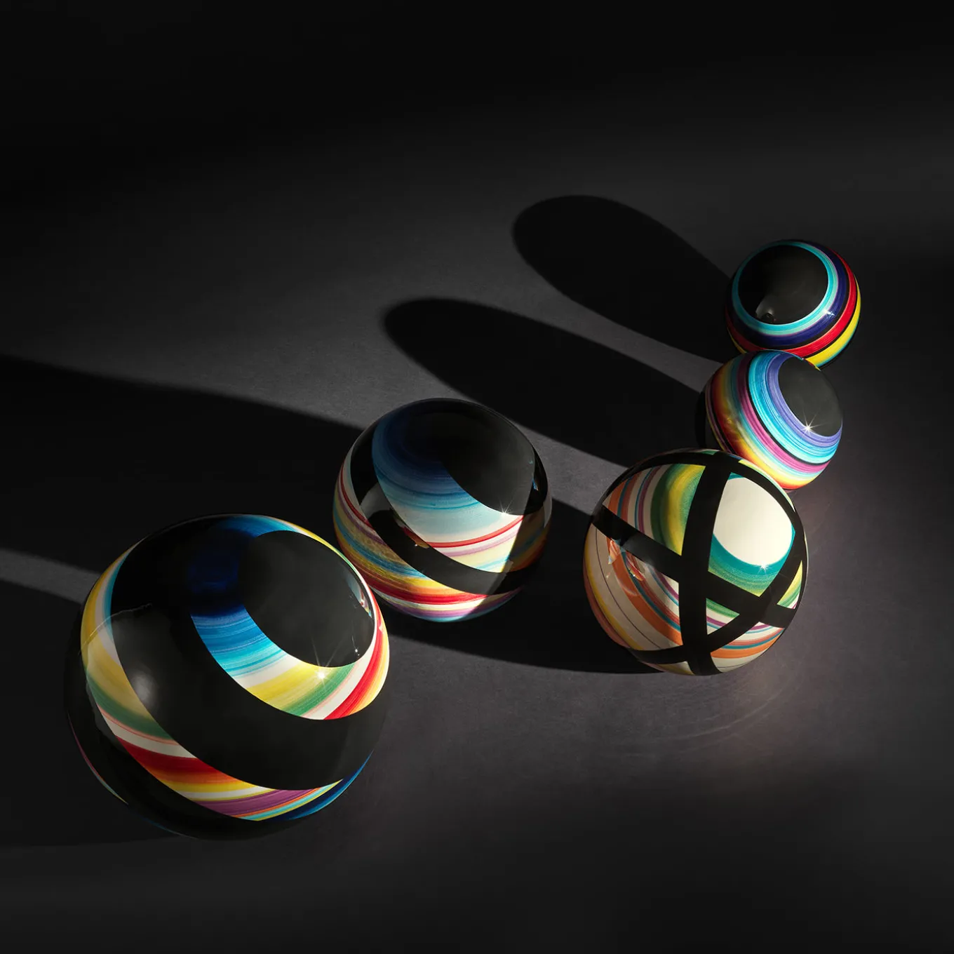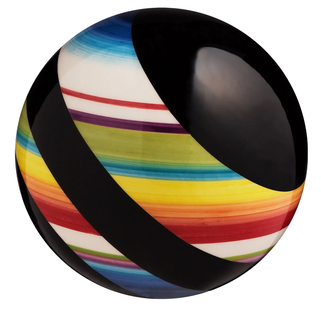 A decorative ceramic sculpture featuring a cosmogony of colorful spheres that evoke the beauty of astral auras. Each piece is shaped with white slip and detailed with black and vibrant brushstrokes, finished with a transparent crystalline glaze. Designed by Jean-Christophe Clair. Available upon request in multiple diameters including 14 cm, 22 cm, 38 cm, and 48 cm. Contact the Concierge for further information.