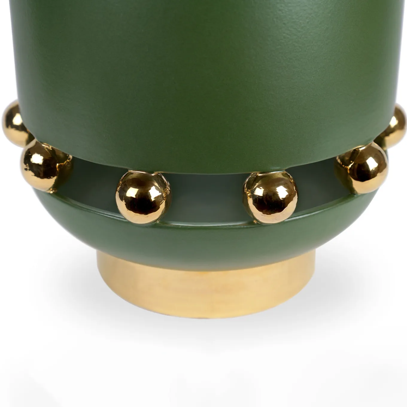 This distinctive decorative vase features a matte green finish contrasted by reflective 24kt gold luster accents. Its design incorporates gold spheres that separate the upper and lower sections of the vase, creating a captivating interplay between matte and glossy textures. Crafted through a complex three-phase firing process, the vase is made in a single piece without assembled parts, highlighting exceptional ceramic craftsmanship and aesthetic simplicity. As each piece is entirely handcrafted, slight variations from the image may occur, reflecting the uniqueness of the handmade process.