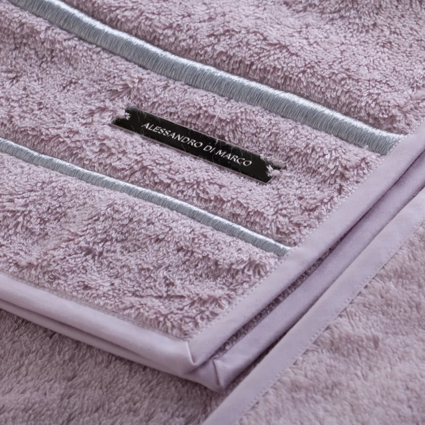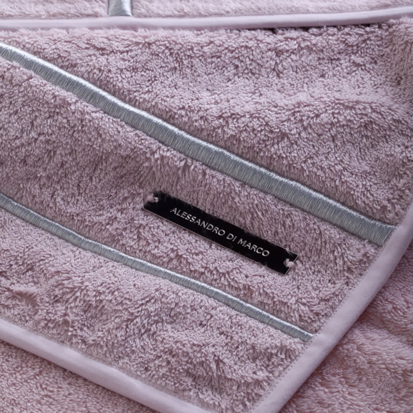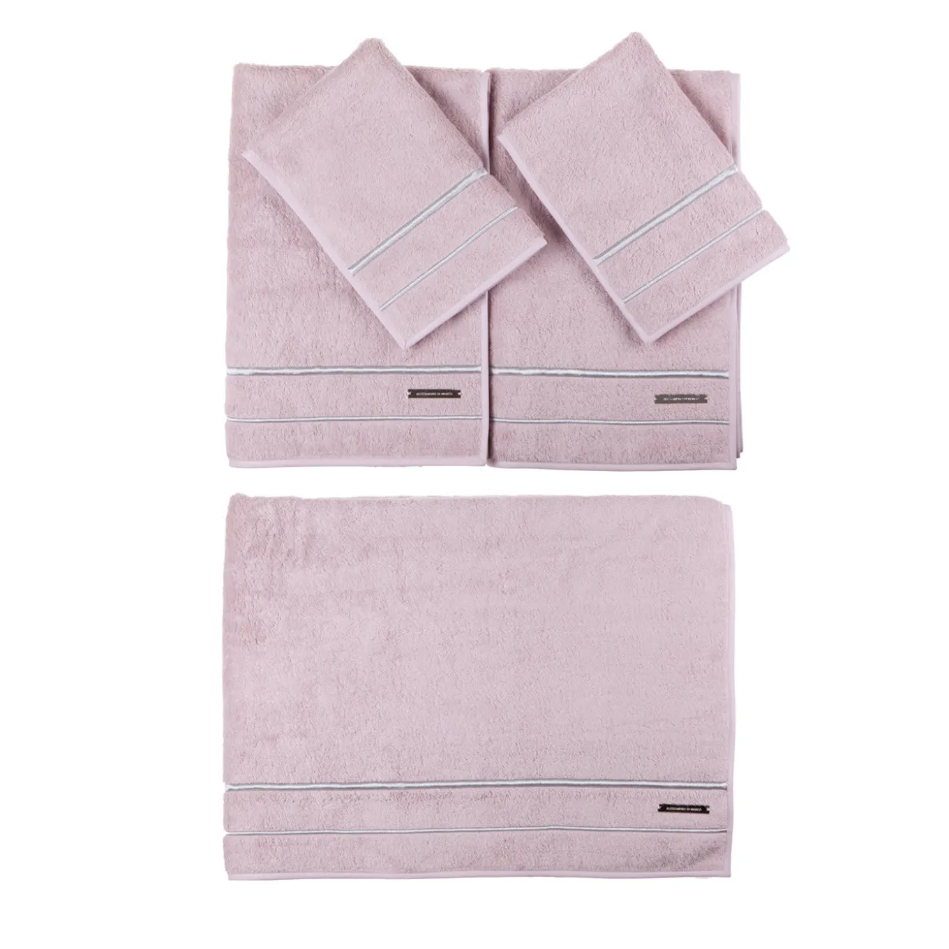 This elegant bath towel set comes complete with 2 small size, 2 medium size, and one large towel in Powder Pink 100% soft Egyptian cotton with hand stitched borders, accented by a two metallic silver ribbons and embroidered with Lurex Yarn. ribbon. Metal logo plate has been embossed and sports a palladium finish.