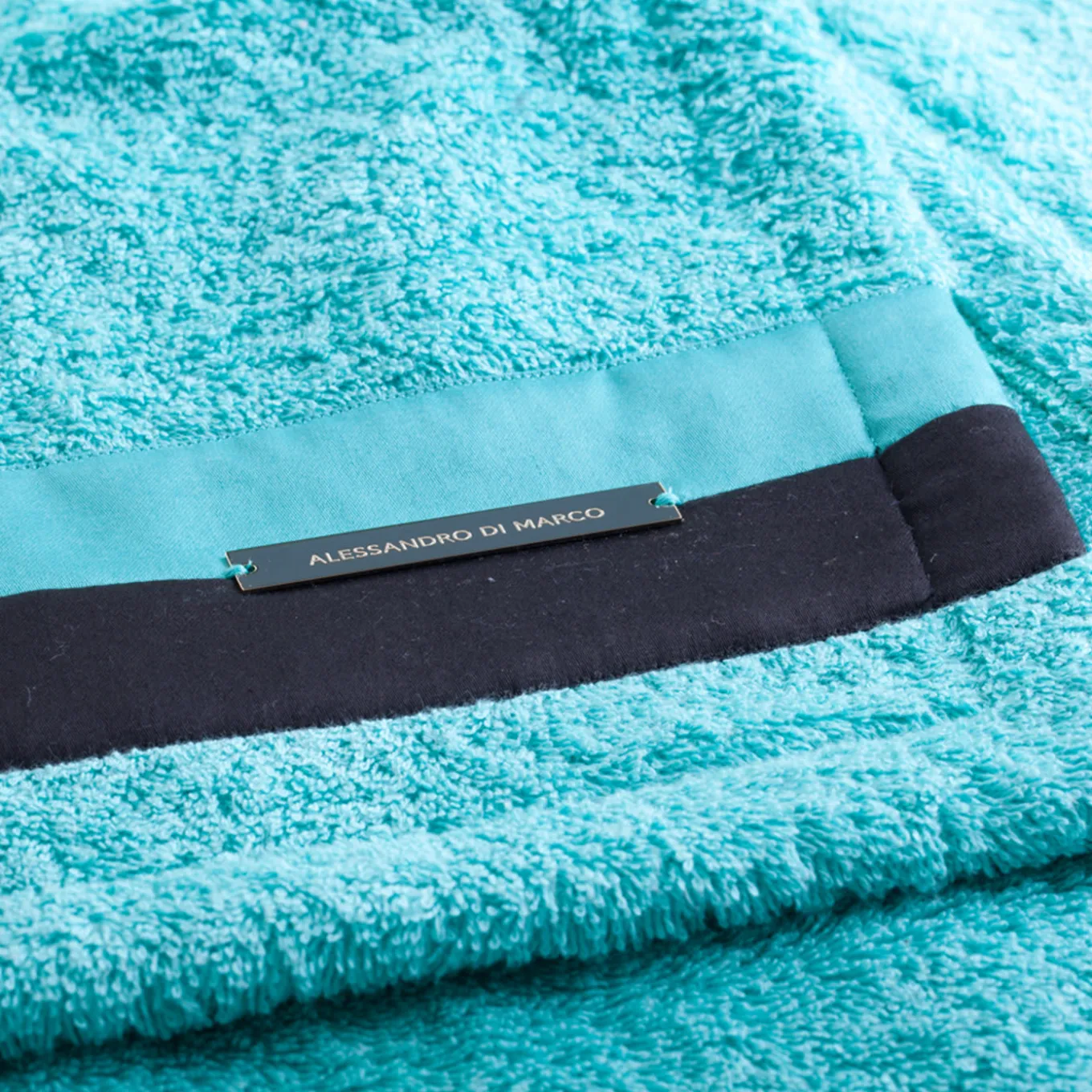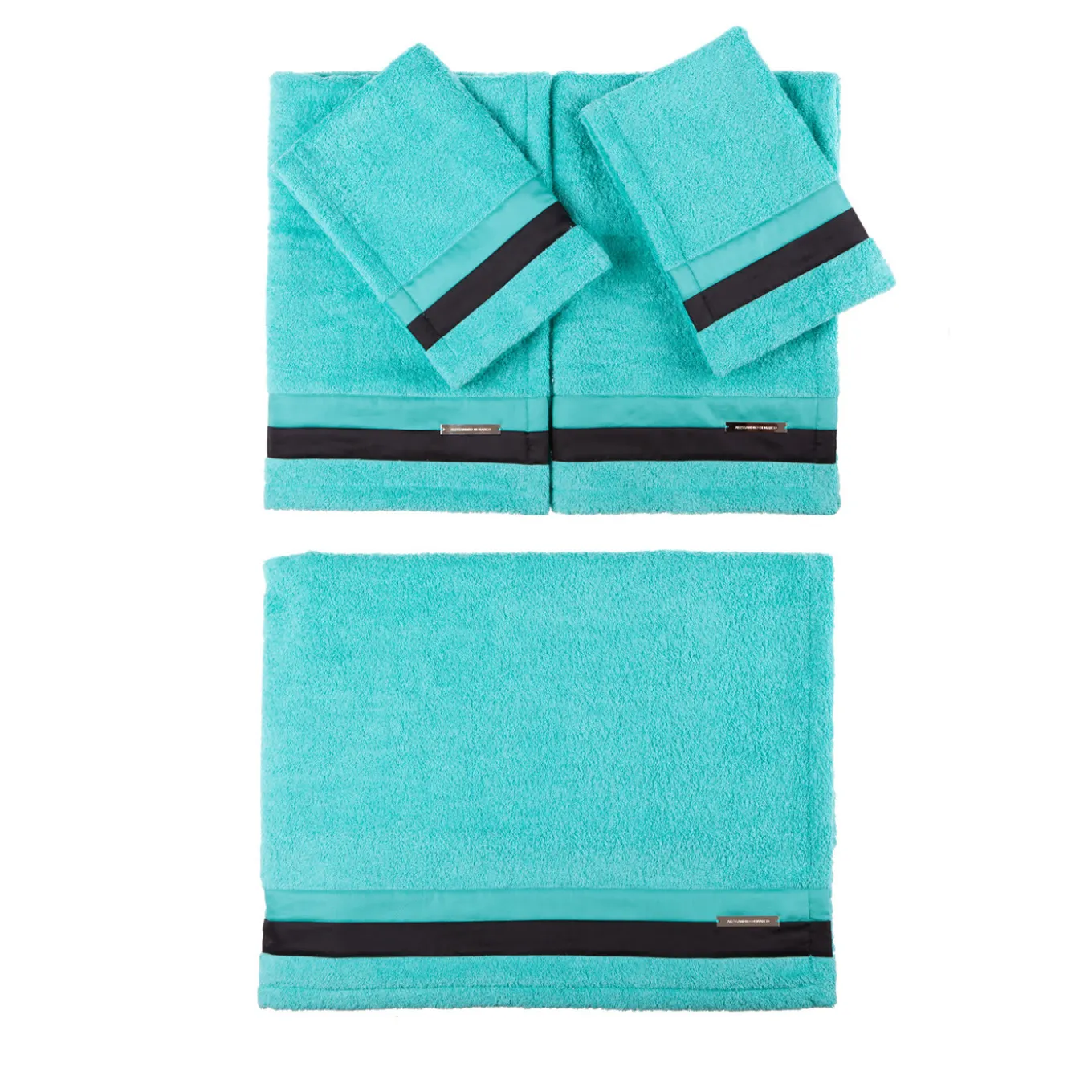 This elegant bath towel set comes complete with 2 small size, 2 medium size, and one large towel in Teal crafted from 100% Egyptian cotton of the finest quality, with hand stitched borders, luxuriously decorated by black satin ribbons. Metal logo plate has been embossed and sports an 18K gold finish.