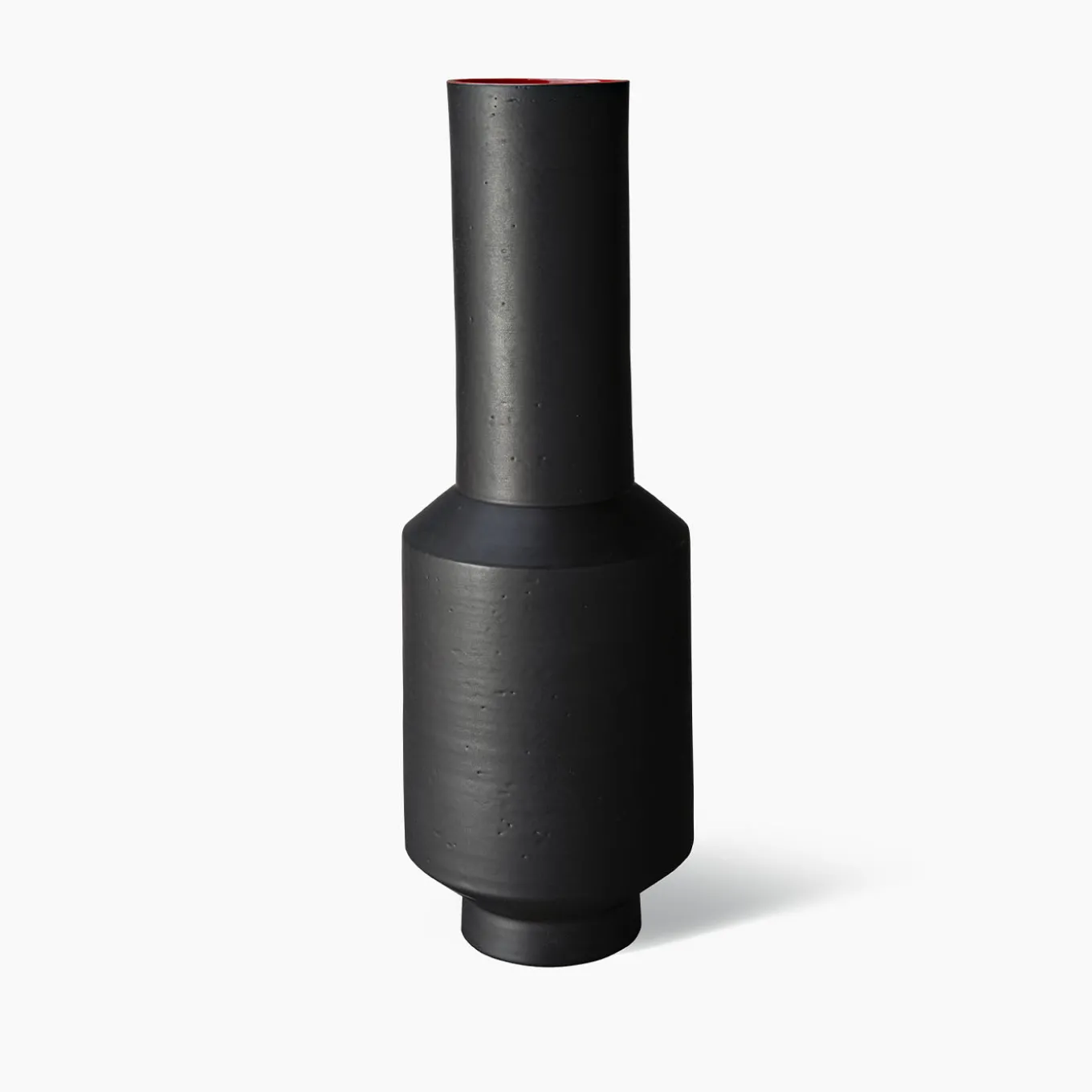 Both a decorative piece and a functional vessel to display long-stemmed flowers and branches, this ceramic vase is part of a limited edition series of 99 pieces designed by Arik Levy George as part of the Tribe Collection. Turned on a lathe using white refractory clay, the geometric silhouette boasts a two-tone enamel finish, an opaque black outside and bright red inside, that enhances the bold proportions of the cylindrical elements that form a stylized bottle shape.