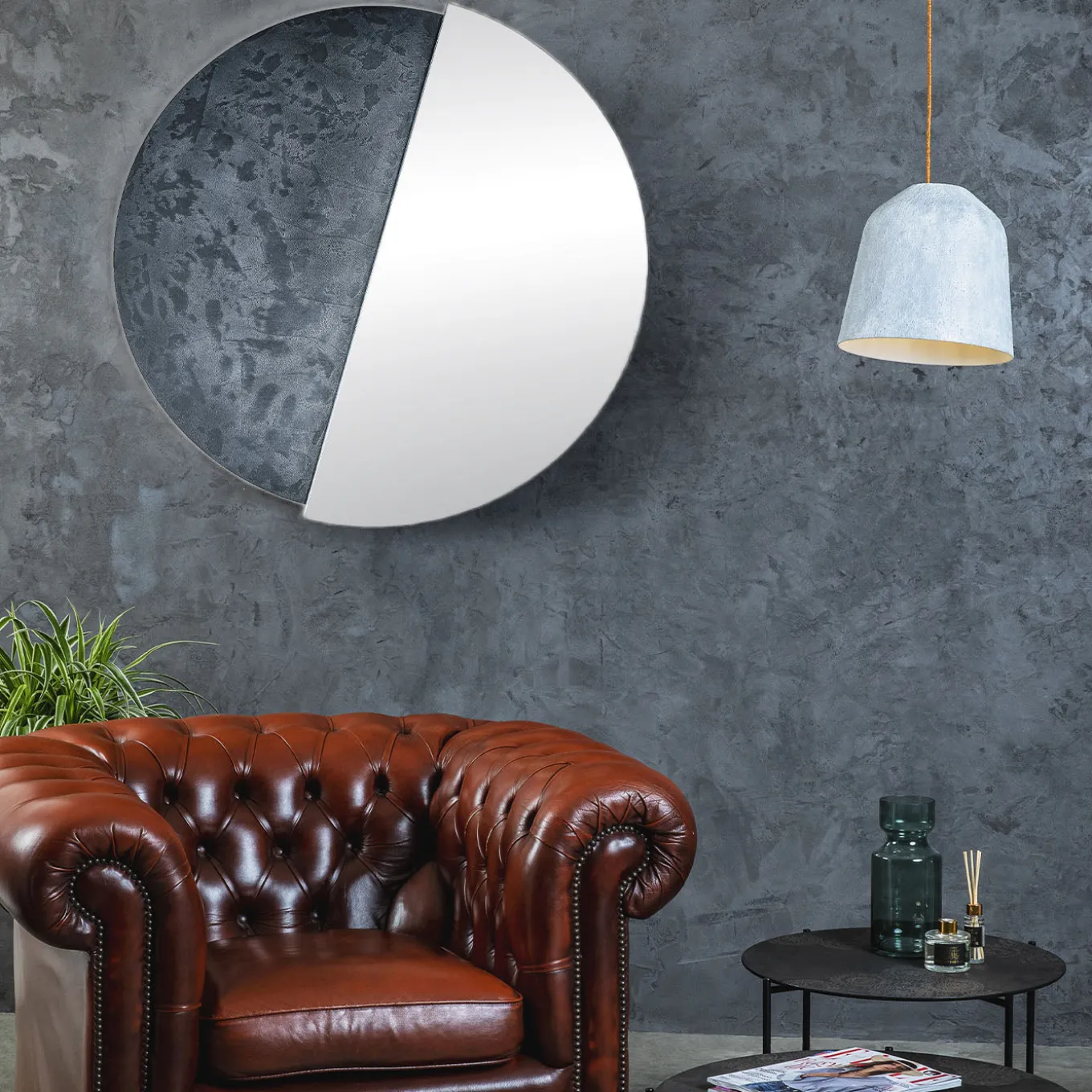 A large round wall mirror featuring a semi-circular reflective surface paired with a semi-circular decorative panel finished with silver troweled resin. Designed for 360-degree rotation, this piece introduces asymmetry and contrast, blending functionality with artistic expression. Each mirror is a unique creation, certified and numbered for authenticity, offering a distinct aesthetic statement for contemporary interiors. Available in various finishes and a smaller 90 cm size option. Please contact the Concierge for more information.