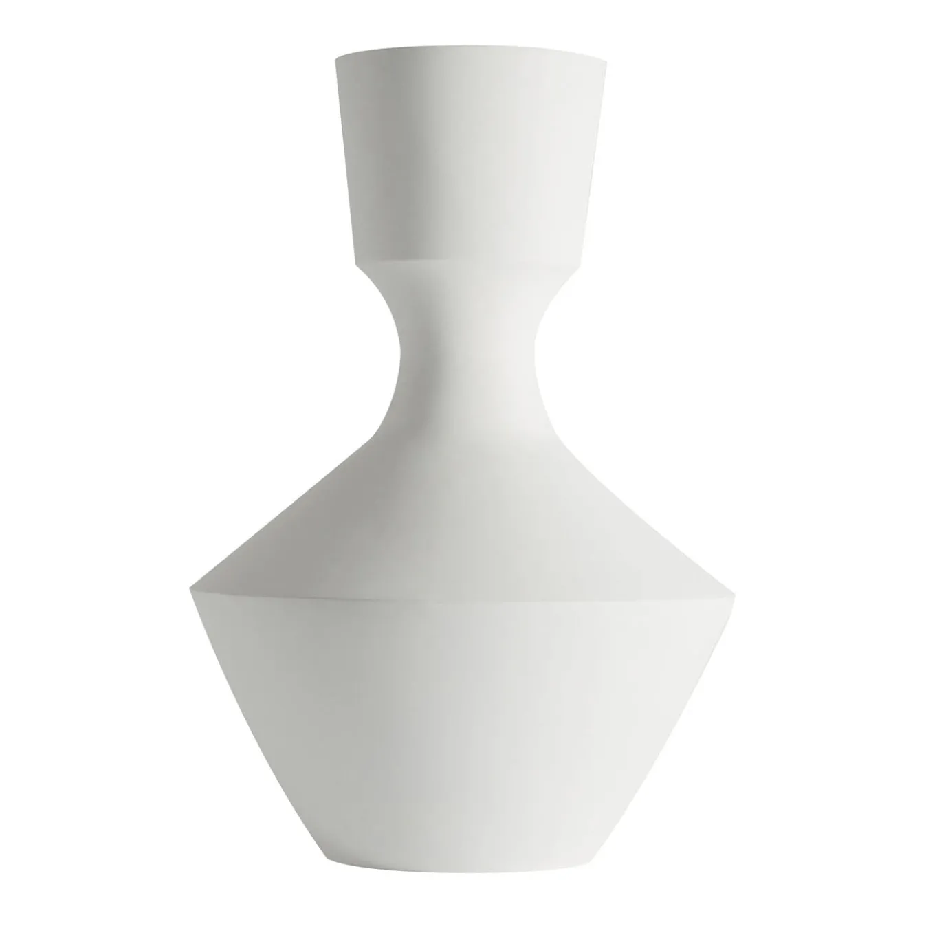 A large matt white clay vase characterized by a geometric silhouette. Its bold size and minimalist finish create a striking yet understated decorative piece suitable for modern interiors. The vase’s design emphasizes clean lines and a matte texture, offering a contemporary alternative for displaying floral arrangements or as a standalone sculptural accent.