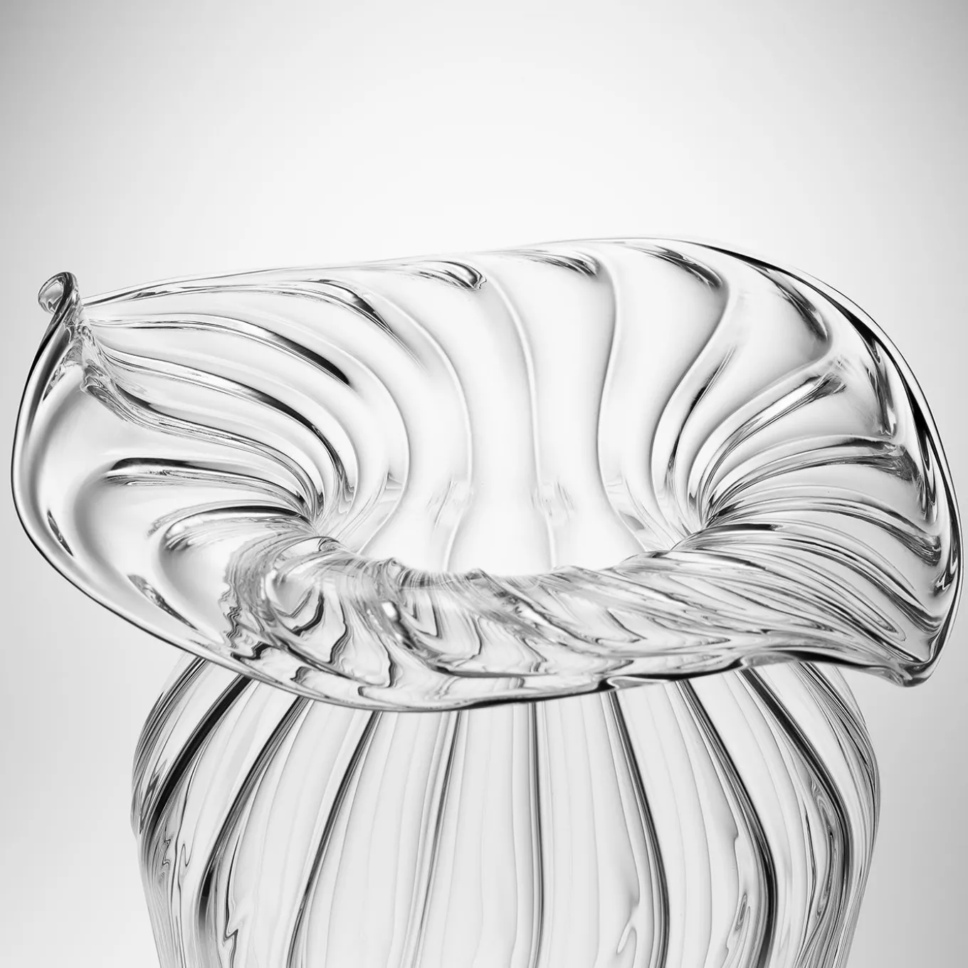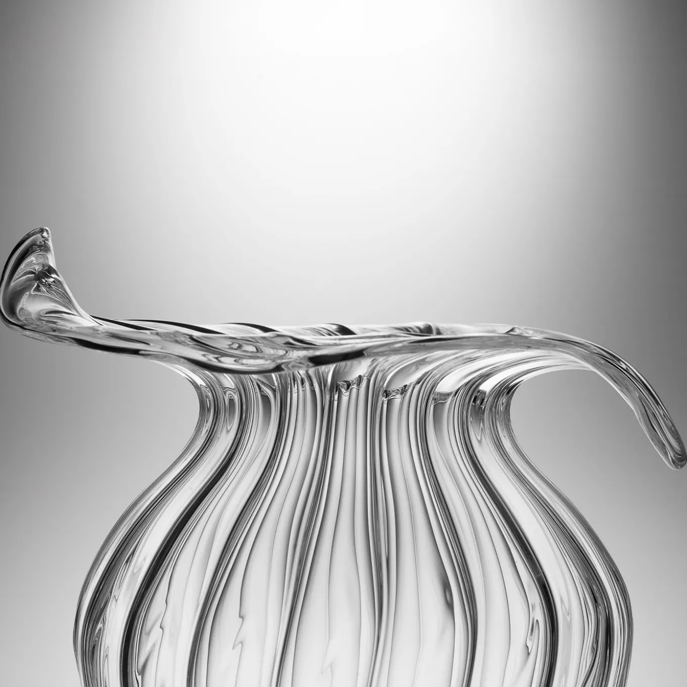 The Large Millerighe vase embodies a unique blend of traditional Italian artistry and modern elegance. Its sinuous silhouette and striped surface create a visual harmony that draws inspiration from the delicate motion of nature, reminiscent of a leaf floating on air. The signature ‘Millerighe’ pattern enhances the vase’s allure, evoking the richness and sophistication of classic Italian design. The upper portion of the vase gracefully unfurls like a peacock’s tail, making a bold statement in any setting. Each piece is meticulously crafted, showcasing exceptional skill and refinement. This vase is not only a functional object but also a stunning decorative element that enhances the ambiance of any room. The Large Millerighe vase serves as a magnificent focal point, ideal for displaying fresh florals or standing alone as a work of art in its own right.