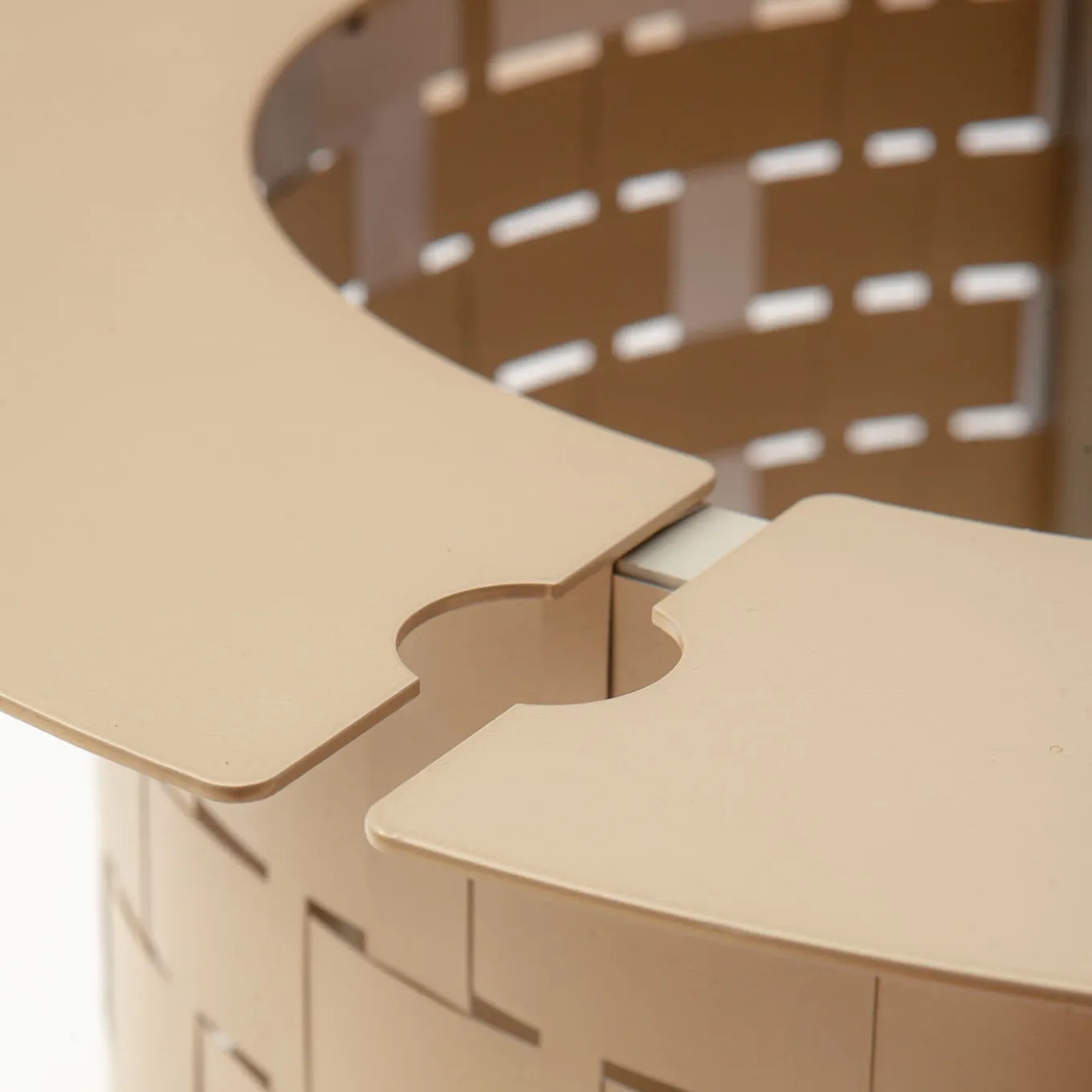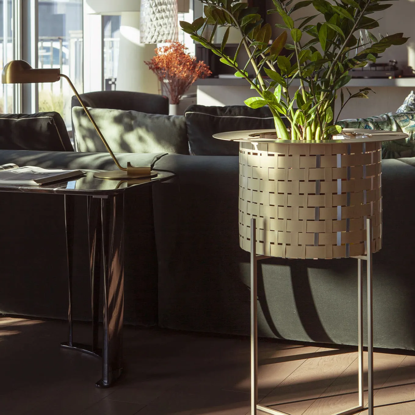 Fashioned of SPLOT® – a mesh of high-grade aluminum foil – this cachepot is designed with versatility in mind. A refined matte golden hue only contrasted by silvery inserts marks its cylindrical silhouette, which is equipped with a wide flat edge enriched with shaped fissures for guests to fit their stem glasses during parties. Multiple variants are available in the Artemest catalog. It is possible to purchase separately the base, please contact the consierge for further information.