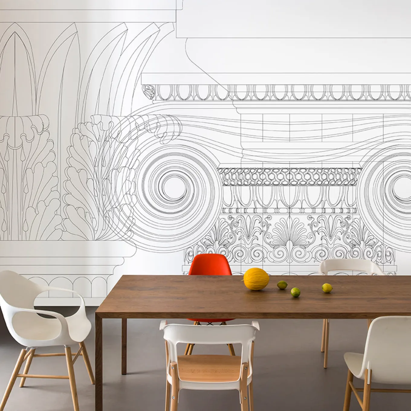 The wallpaper collection Layers elaborates on several temporal and geometric juxtapositions by imagining a digital past. Classical elements like columns and capitals, in a triumph of wireframe shapes. Design by Chiara Pellicano and Edoardo Giammarioli. Price per squared meter.