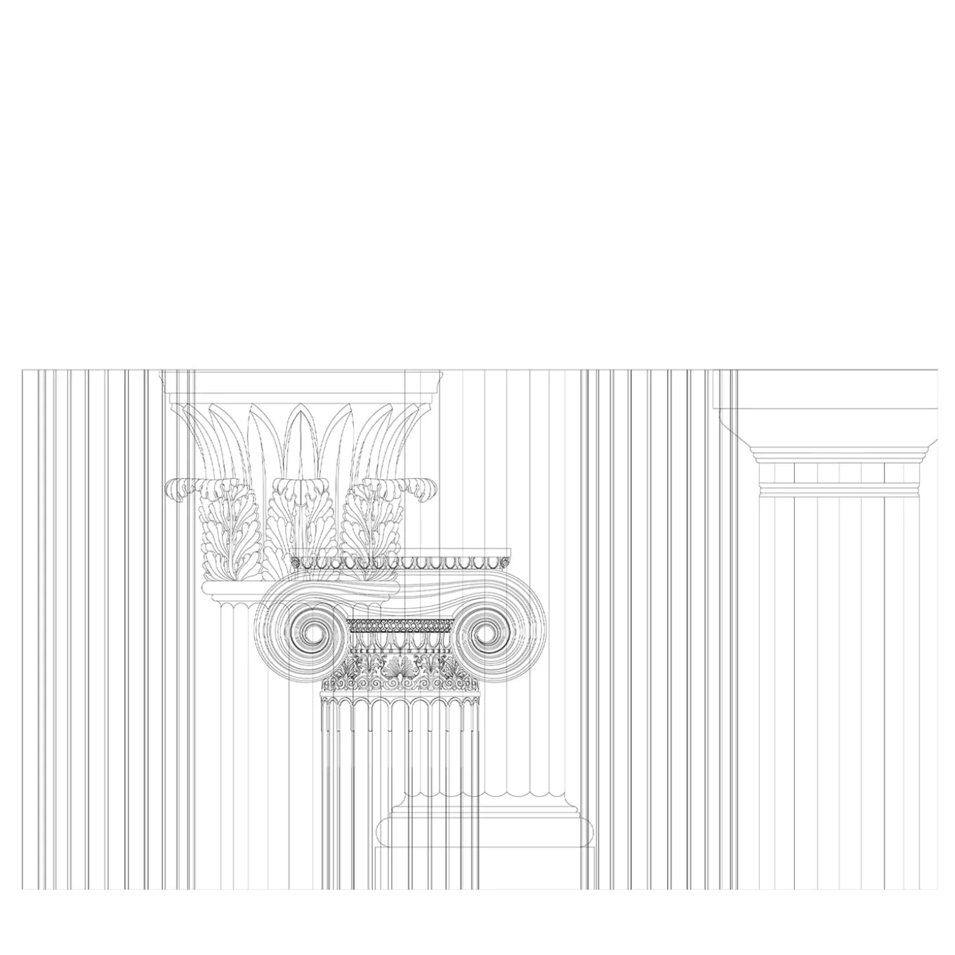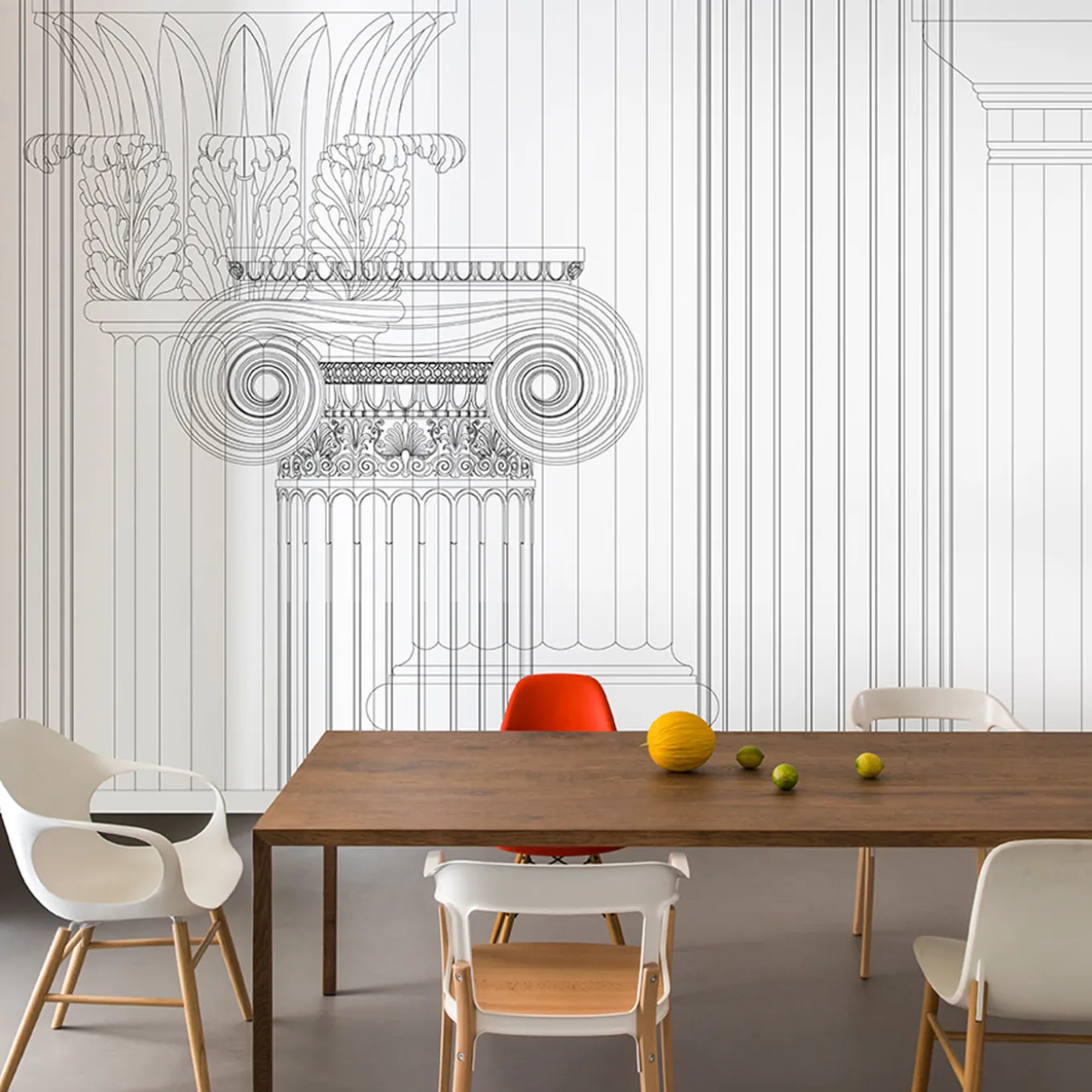 The wallpaper collection Layers elaborates on several temporal and geometric juxtapositions by imagining a digital past. Classical elements like columns and capitals, in a triumph of wireframe shapes. Design by Chiara Pellicano and Edoardo Giammarioli. Price per squared meter.