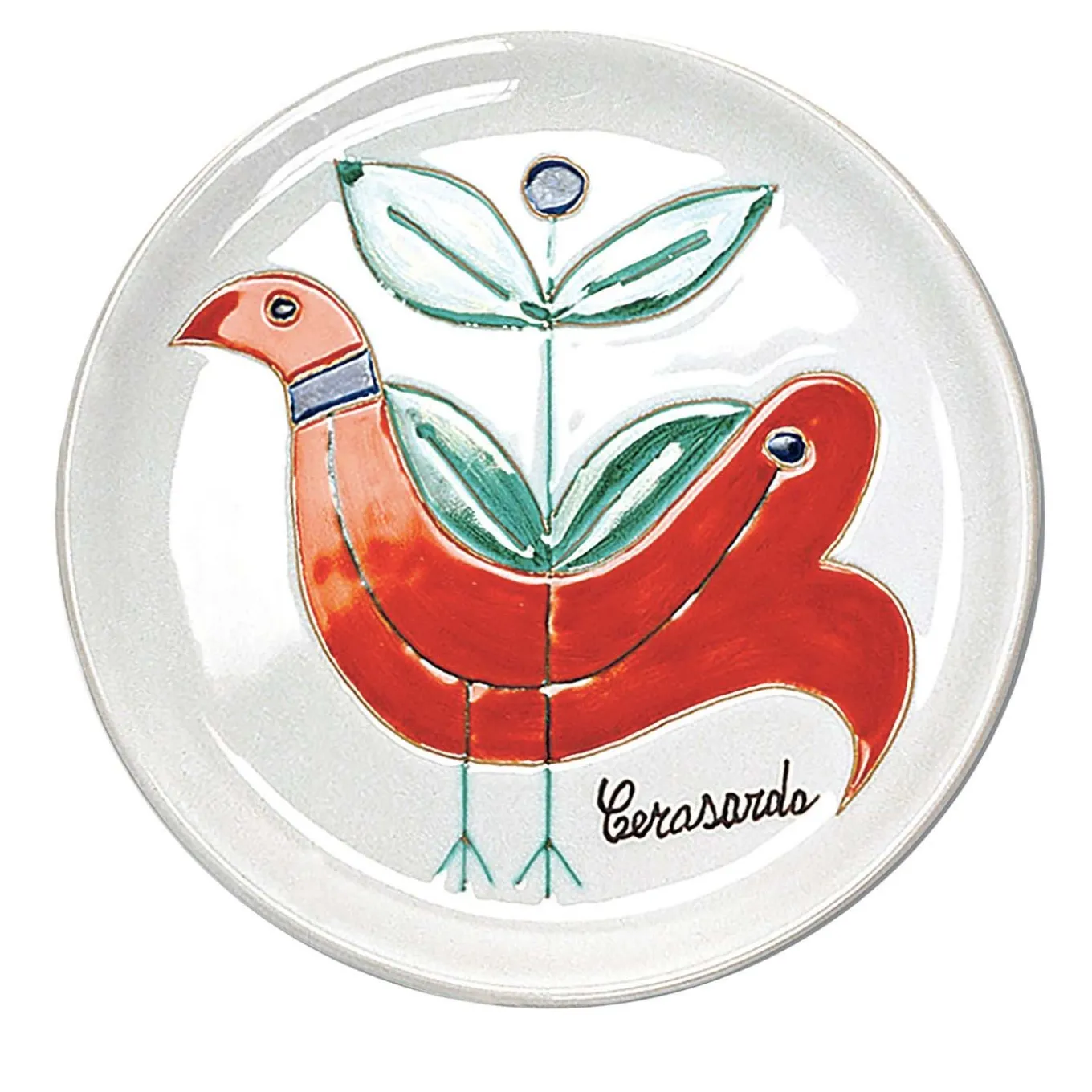 Part of a series of handcrafted plates, this piece is decorated by hand with a stunning Sardinian symbol of peace, the “pavoncella”, peacock. The stylized bird, originally adorning ancient Sardinian chests, is depicted in a fresh style using the graffito method, whereby the terracotta is scratched to incorporate the vividly hued enamels for a unique object of functional decor.
