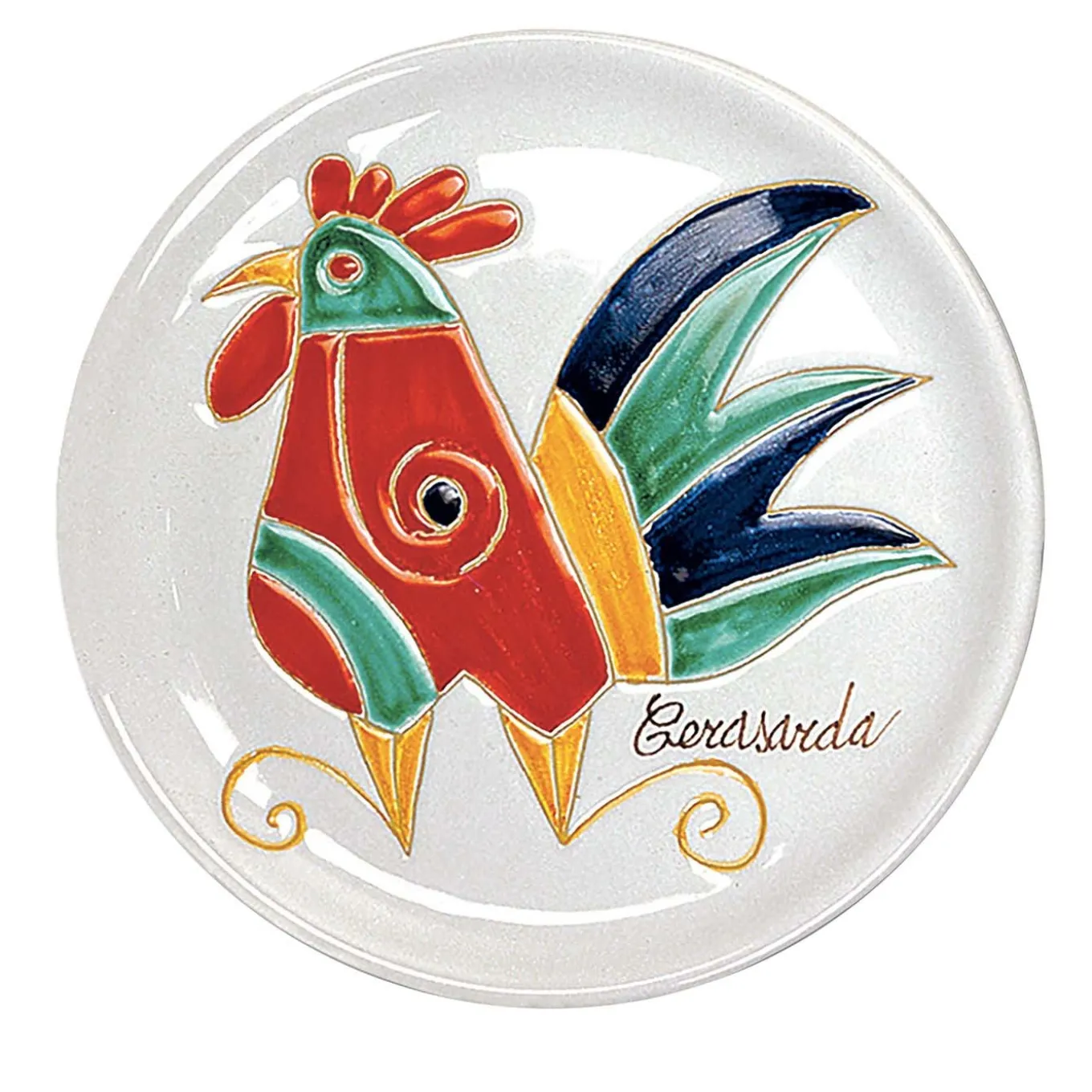 This superb plate is part of a series of handcrafted pieces that interpret the traditional “pavoncella” peacock, a classic decorative motif in Sardinian culture. The bird is rendered in vibrantly colored enamels applied by hand using the graffito technique, by scratching the terracotta to obtain each time a unique and eye-catching object.