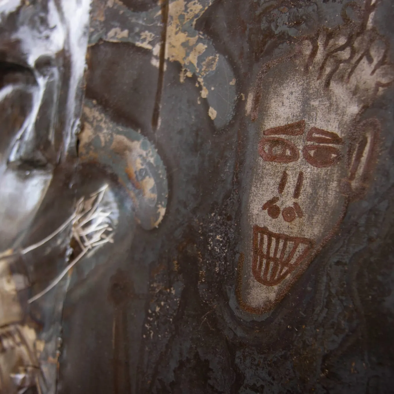 Visionary, provocative, and mysterious, this one-of-a-kind iron artwork stands on between painting and sculpture. Its defying-labels nature is reflected in its subject, where a naked woman’s backside protrudes from the panel, paired to a funny facial expression and a stately male figure – deliberately unproportioned – that picks a flower from the ground.