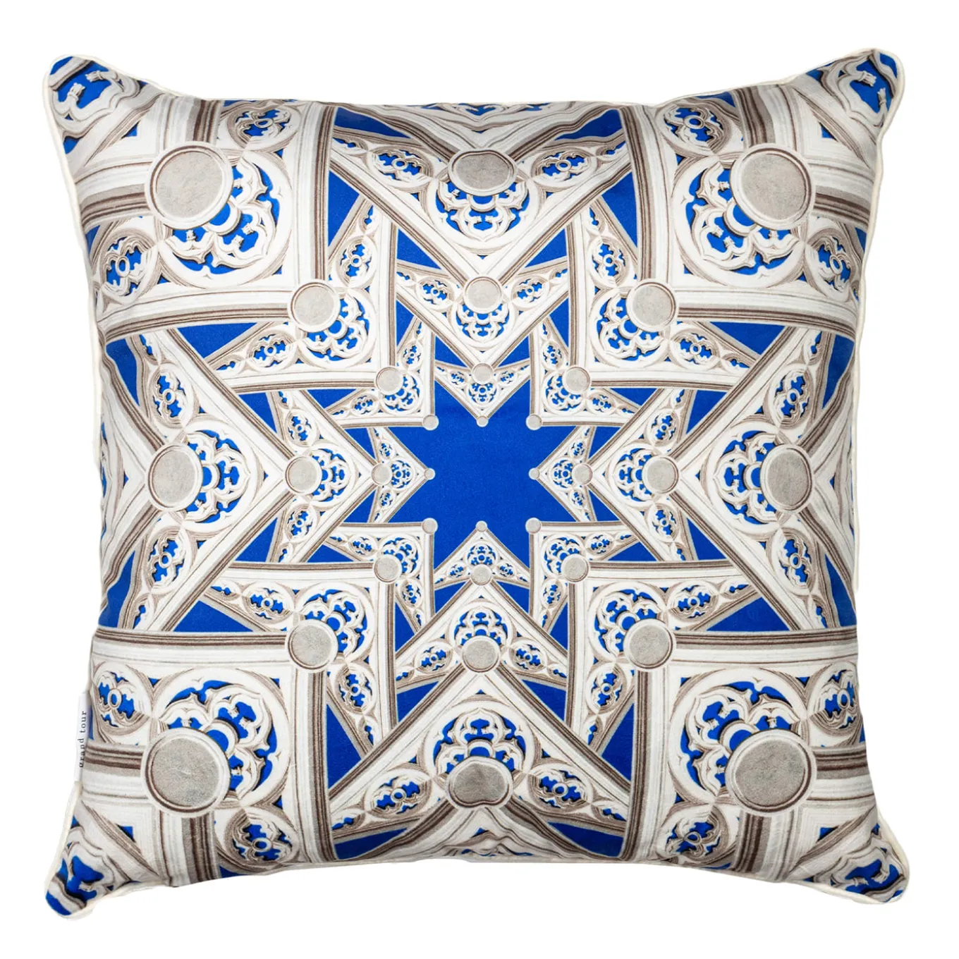 This cushion is part of “Le Volte Celesti” Collection, that creates, through the use of some historical sketches of frescoes dedicated to the naves of the Duomo, some geometric, almost kaleidoscopic games. The honor of having been able to work on these precious materials, never seen before today, makes this project unique and exciting.