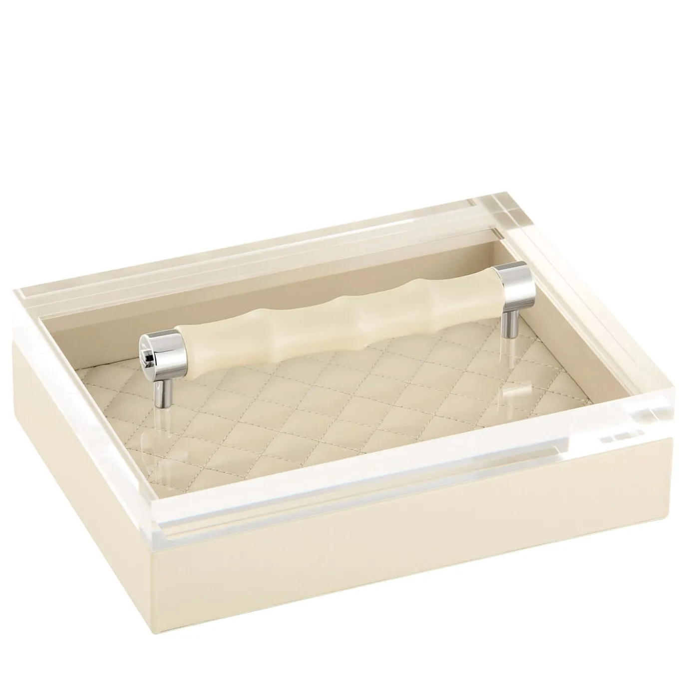 This elegant and versatile leather-covered box, part of the Lea Collection, is a testament to fine craftsmanship and timeless elegance. It boasts a acrylic lid with leather covered bamboo handle and quilted diamonds padded lining.