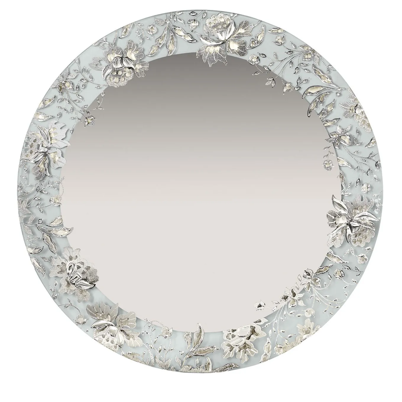 Léa round silver wall mirror features an elegant, intimate design ideal for small spaces or decorative vignettes. This piece is entirely handmade, with unique variations and subtle imperfections that enhance its artisanal character. The mirror’s delicate floral detailing on the border adds a refined touch, combining classic charm with a contemporary aesthetic suited for sophisticated home décor.