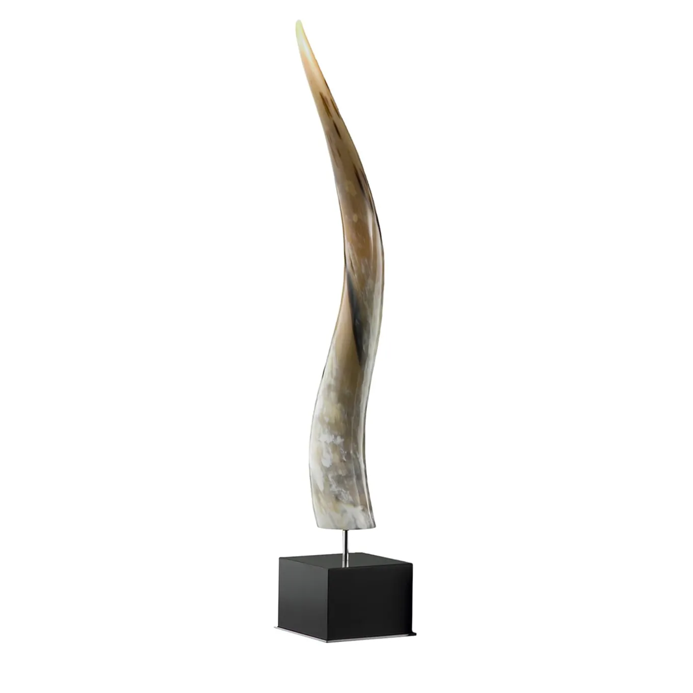 Opulence and simplicity merge in this singular sculpture, consisting of an authentic horn raised on a minimalist and elegant base. Sustaining the horn by means of a stainless steel pedestal support, the wooden base is lacquered in glossy black to enhance the horn’s veins and shades by contrast. Due to its intrinsic uniqueness, each sculpture may also vary in height between 80 and 90 cm.