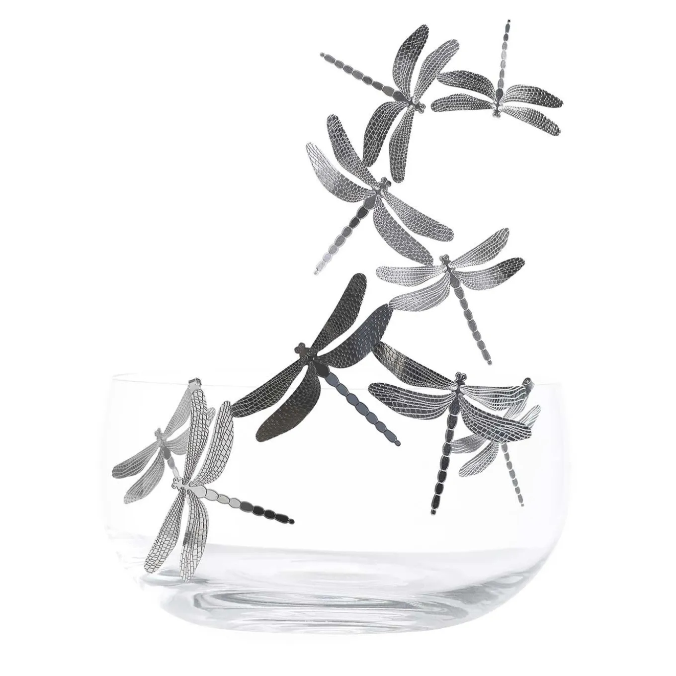 Designed by Gherardo Frassa for the Frutteti collection, this stunning bowl is made of Bohemian crystal and is decorated with removable dragonflies made of polished stainless steel, whose elegance and grace symbolize freedom, “libertà” in Italian. The dragonflies are exquisitely detailed with delicate engravings and seem to fly over the bowl with their fluttering wings. This sophisticated piece of functional decor will transform a classic crystal fruit basket into an art piece that can be displayed on a dining table or console to add a romantic touch into any interior.