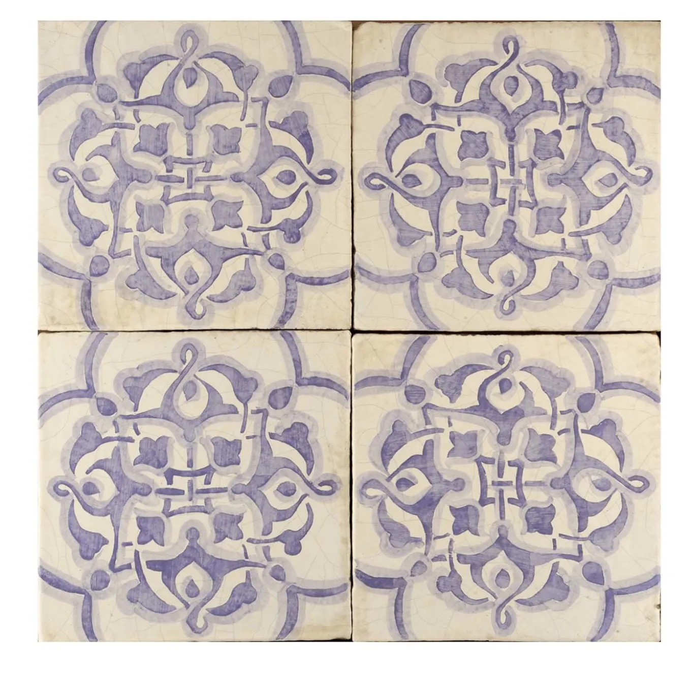 Stunning in all its details, this sophisticated majolica tile is a poetic ode to Sicilian artistic traditions. Marked by an entirely handmade production process, these tiles boast a stunning design of four circular elements composed of interwoven scroll-and-frond motifs painted in lilac on an ivory background. An undulating outline frames the individual elements, creating visual and geometric continuity. This tile is best showcased in a series as a wall panel in a kitchen, dining room, entryway, or patio, the matte glaze conferring a smooth, ever-vibrant finish.
