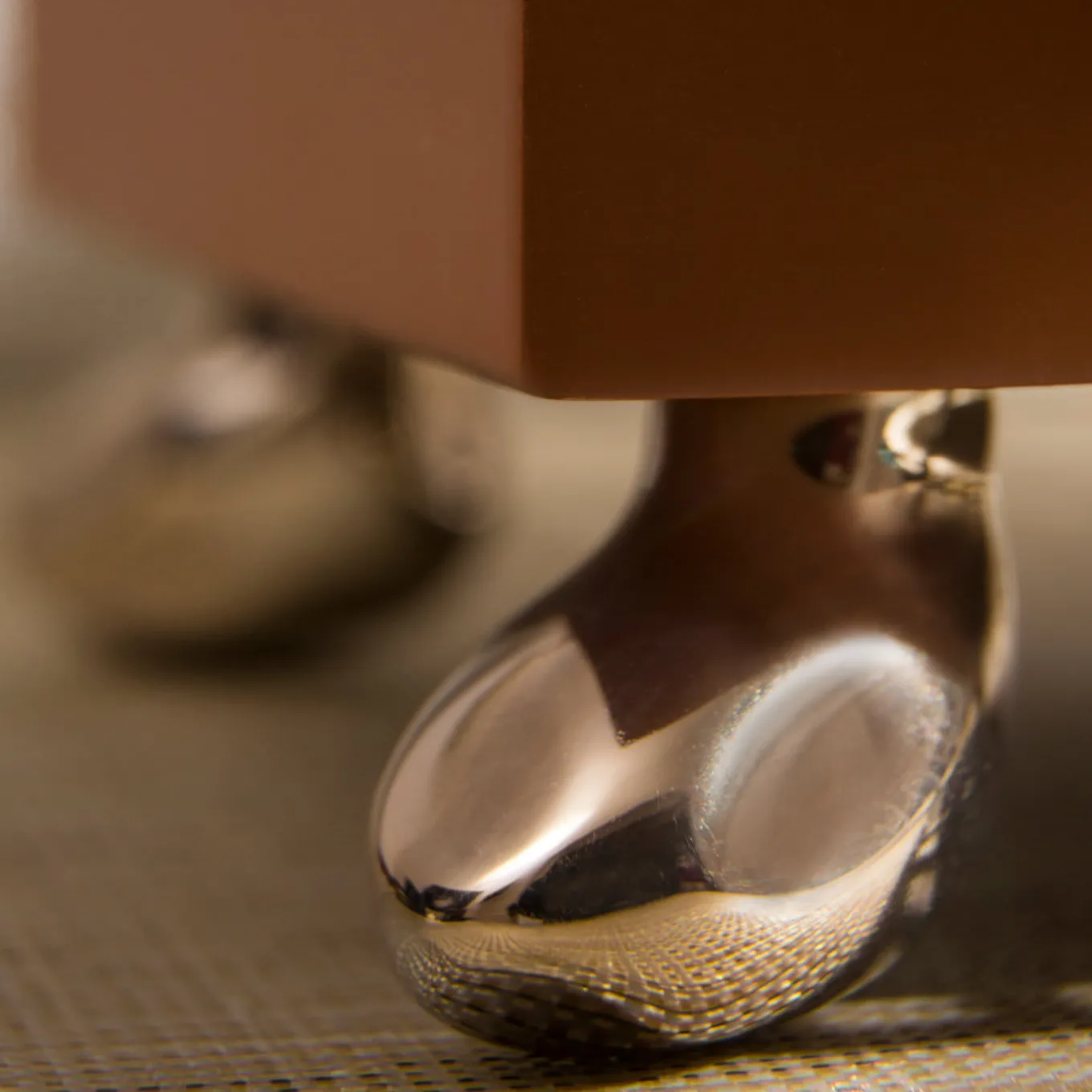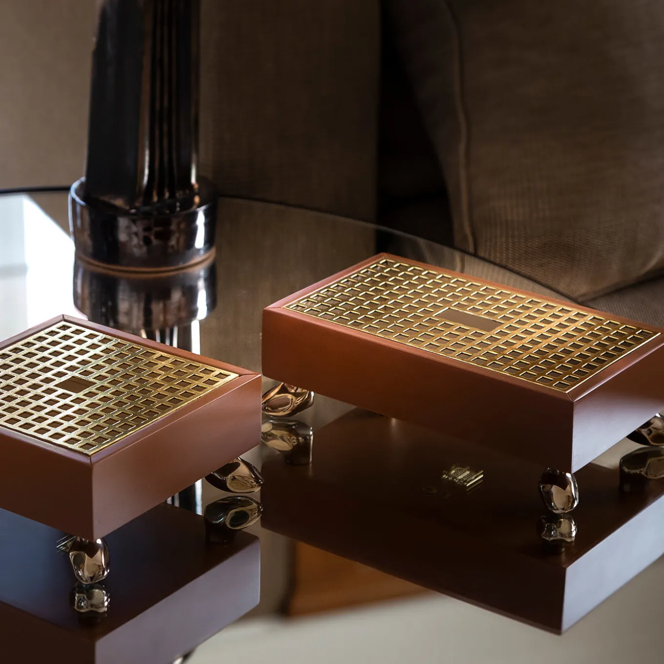 This artisan sophisticated box makes for a luxe home for tiny objects and can also serve as uplifted vide-poche thanks to the grid-like design of its brass lid, preciously inspired by the floor of the Archdiocese Munich Cathedral. The storage unit is comprised of two boxes nested into each other, revealing a white lacquer on the inside and a warm brown lacquer on the outside of the wooden frame. Glistening, pebble-like metal feet complete the design.