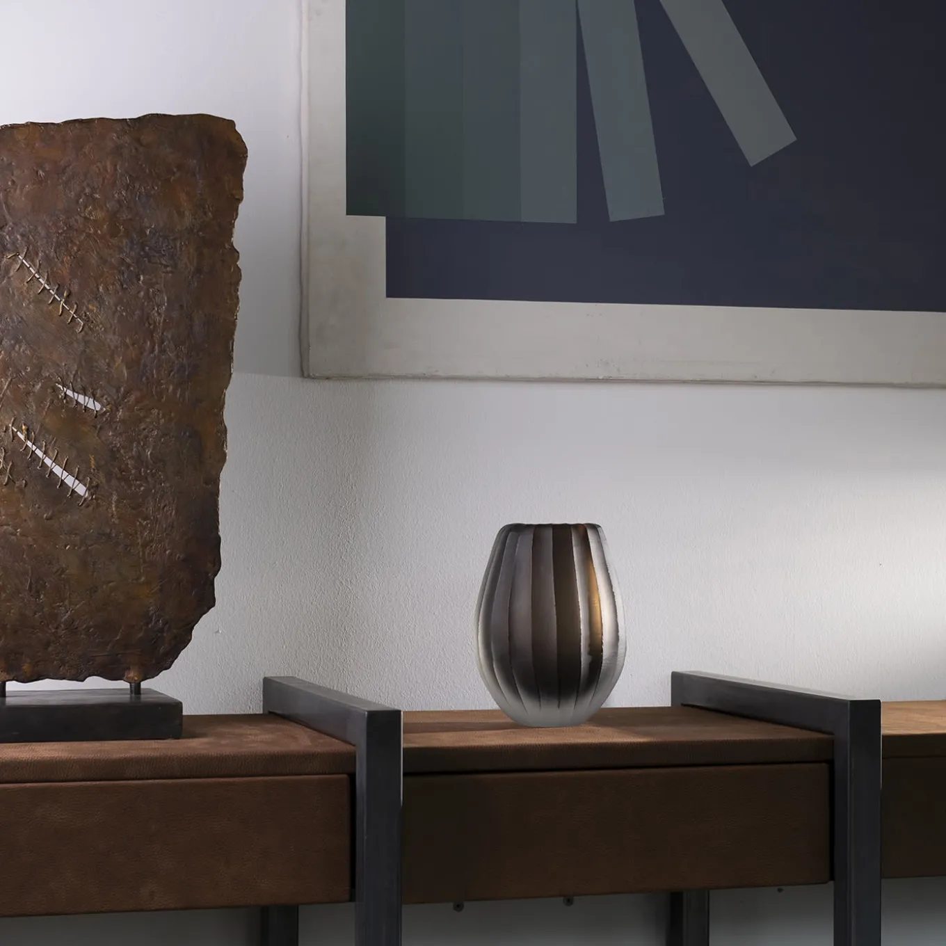 Linae Mini is a small-sized vase designed by Federico Peri. The main feature of which lies in the engraving of the glass surface. Thick vertical lines, a rounded shape that softens the profile, and a solid clear glass base that seems to let the color float inside the vase, make this small piece of home furnishing an object of strong character. Please ask the Concierge for further information.