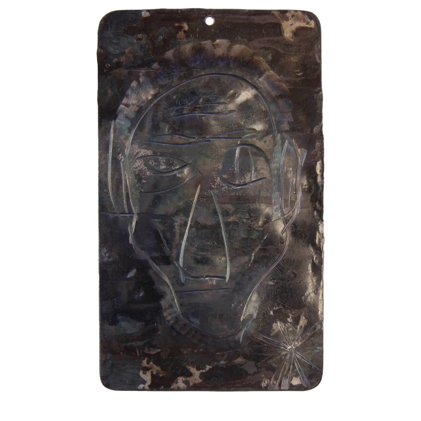 Etched profiles of a stylized human face recalling the ones of old Indian people mark the decorative focus of this singular artwork, handcrafted by artist Lorenzo Quadalti and symbolizing how time and youth fly away as the years go by in favor of a more conscious phase of life in old age. Soft, shaded effects obtained using solvents complete the aesthetic of this singular piece.