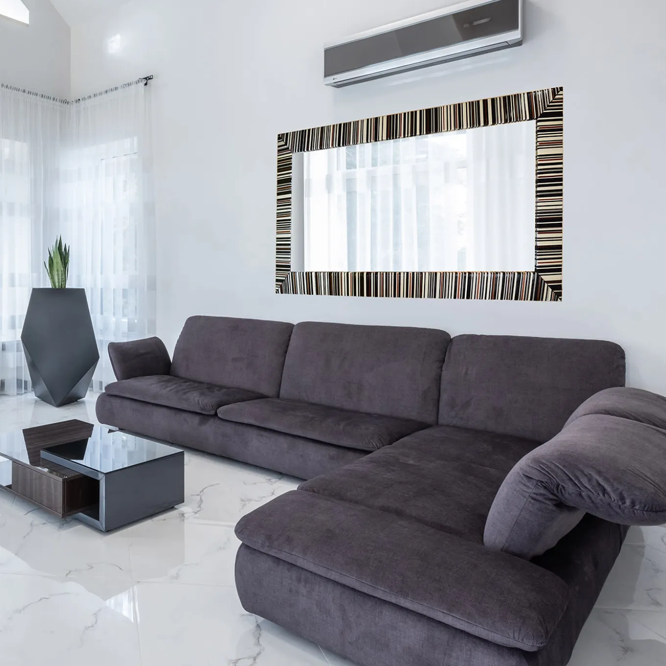 Art and opulence merge in this superb wall mirror, singular artisan piece obtained from the meticulous manual assembly of matte Murano glass sticks. Offered in a captivating combination of ivory, black, and aventurine tones, the hypnotizing striped pattern extends throughout the rectangular frame, sustained by a structure featuring natural and sustainable materials. Please explore customization options with the Concierge.