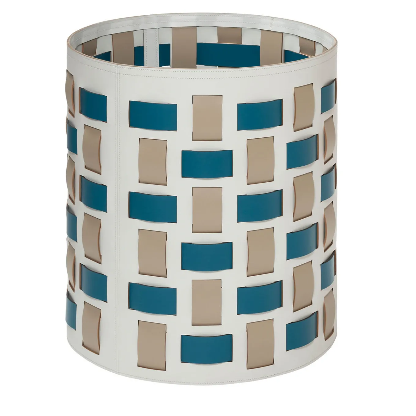The Lisbona baskets’ design comes from the variation of a classic weave with vertical and horizontal bands in which create to a mosaic effect. The surface that acts as a frame for the bands acquires importance and, from simple background, it becomes a decorative element able to enhance the weave and its design. Finest regenerated reinforced leather structure with water-resistant and UV-resistant finish. Ideal for laundry, towels, magazines or everyday objects. Fit for indoor and outdoor use.