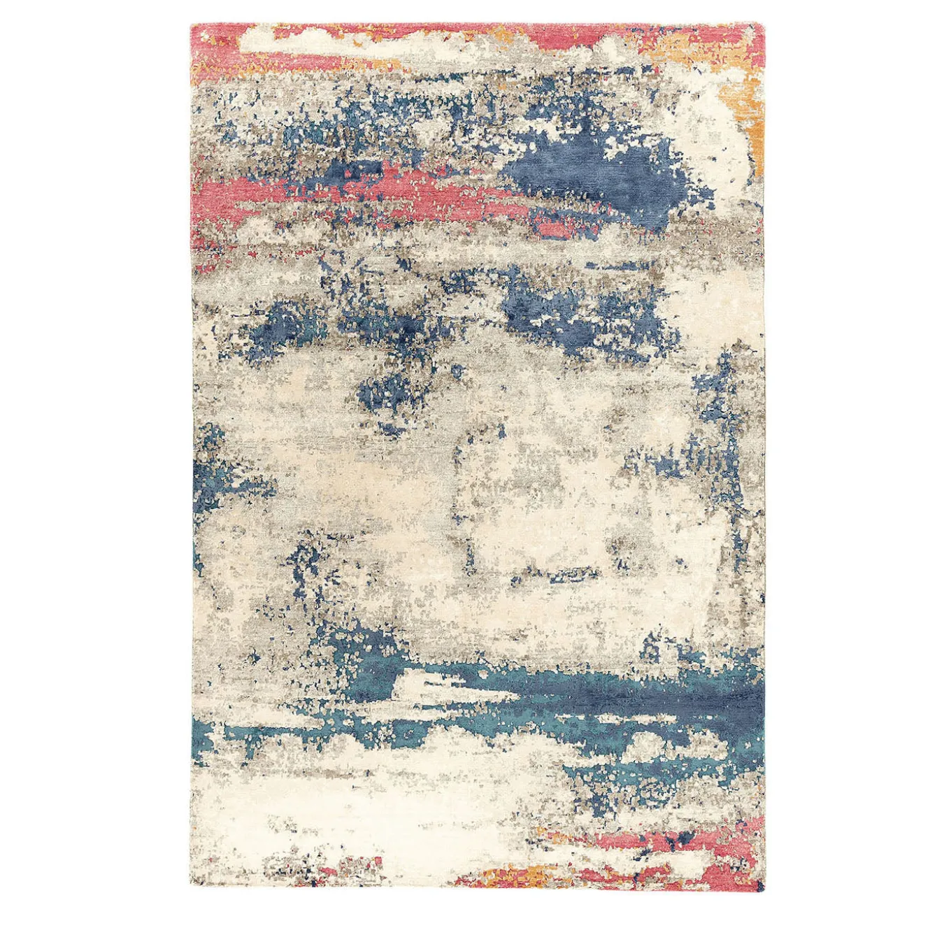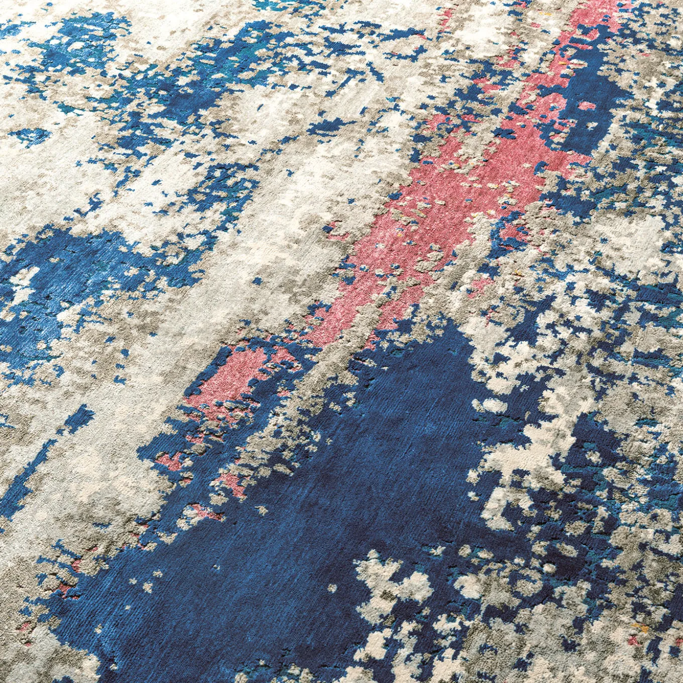 The loft l311a bamboo silk contemporary rug features an abstract design inspired by oriental influences, combining shades of blue, beige, coral, and hints of yellow for a dynamic visual effect. Part of the loft collection known for its premium hand-knotted bamboo silk craftsmanship, this rug offers a unique interplay of texture and color. Available in various sizes, it suits diverse interior styles by providing a sophisticated, timeless accent to any living space. Made in India. Contact the Concierge for more information.