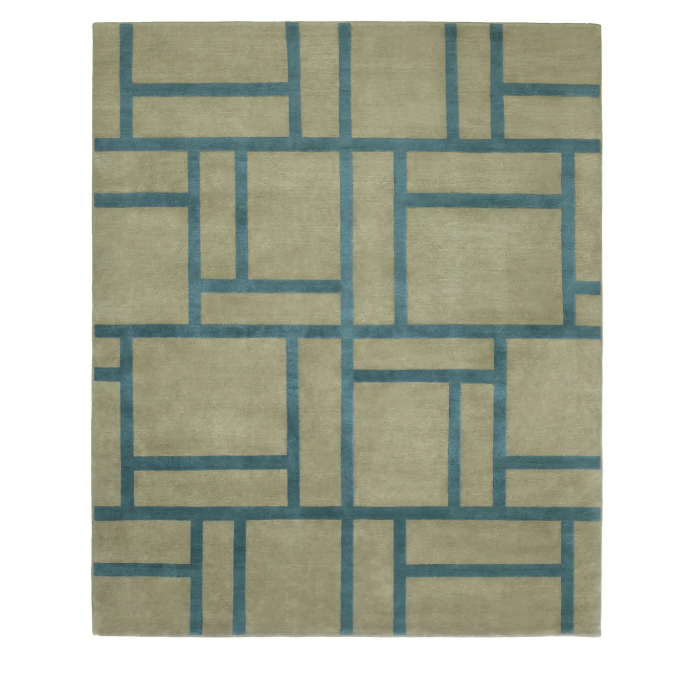This magnificent rug, designed by Johanna Gullichsen, will be an exquisite addition to any home. It was hand knotted in Nepal and its 100 knots are in a soft blend of 50% wool and 50% silk. The light green-brown background is enriched by squares and rectangles that create a modern, sophisticated pattern in vivid turquoise color sure to make a statement in any room. Custom colour and quality, unique piece.